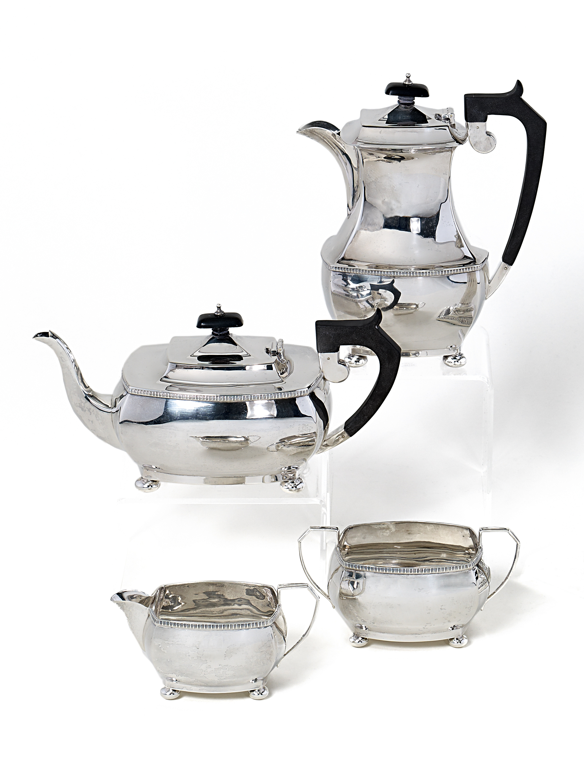 Silber. Ebenholzhenkel und -knäufe. Bestehend aus Kaffeekanne, Teekanne, Milchgießer und Zuckerschale. Ca. 1374g. Höhe der Kannen 22,5cm bzw. 12,5cm.