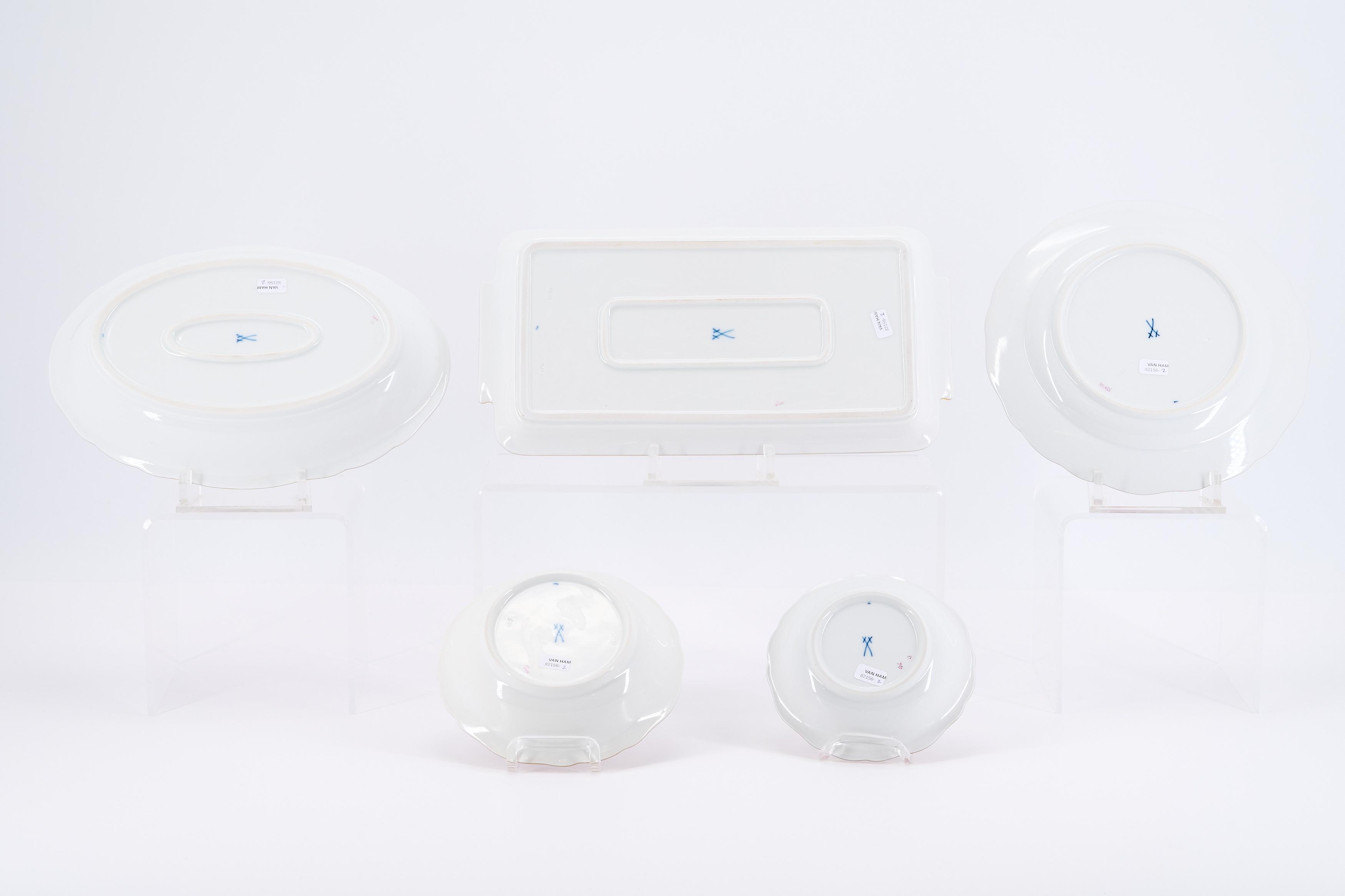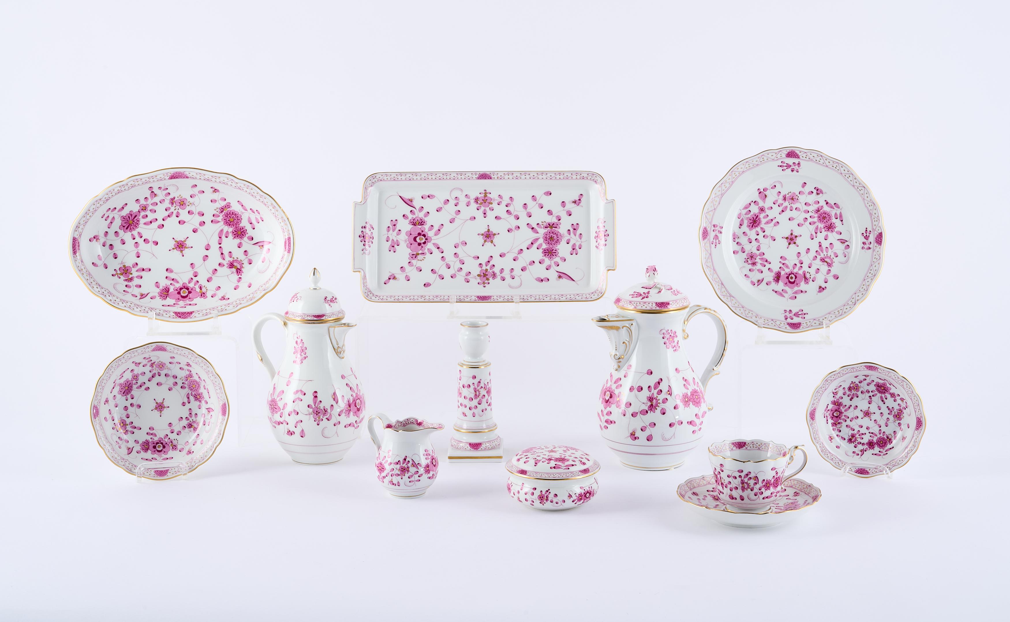 Form: Neuer Ausschnitt. Insgesamt 46 Teile, bestehend aus: 2 Kaffeekannen (Höhe 21,5/21cm), 1 Milchkännchen (Höhe 8cm), 12 Kaffeetassen (Höhe 6,5cm), 12 Untertassen (Ø 14cm), 12 Kuchentellern (Ø 22cm), 1 rechteckigen Tablett (29x15cm), 1 ovalen Schale (24,5x17cm), 1 runden Deckeldose (Ø 9cm), 2 kleinen Schälchen (Ø 22/14,5cm), 2 Kerzenleuchtern (Höhe 14,5cm). .