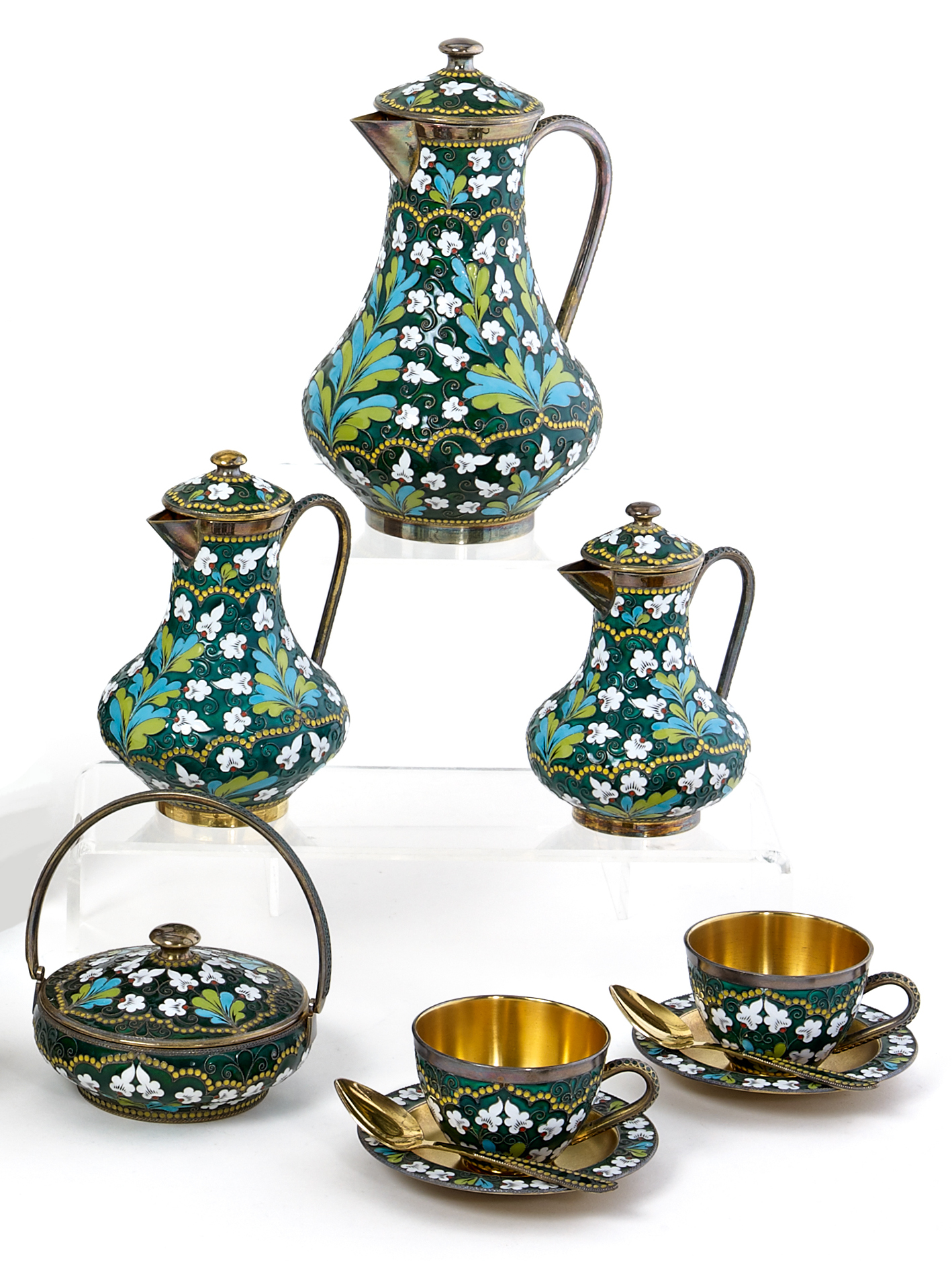 Silber vergoldet, farbiges Emaildekor. Auf grünem Grund florales Dekor mit weißen Blüten und Ranken. Insgesamt 22 Teile.