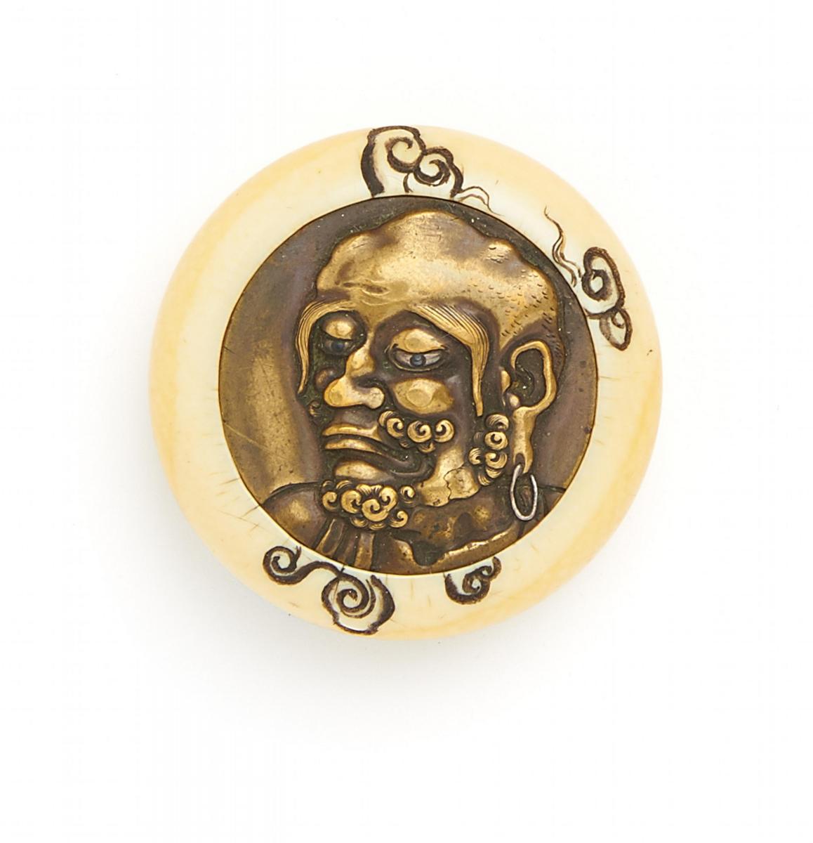 Technik: Elfenbein, Platte Sentoku. Augen aus eingelegtem Shakudô.