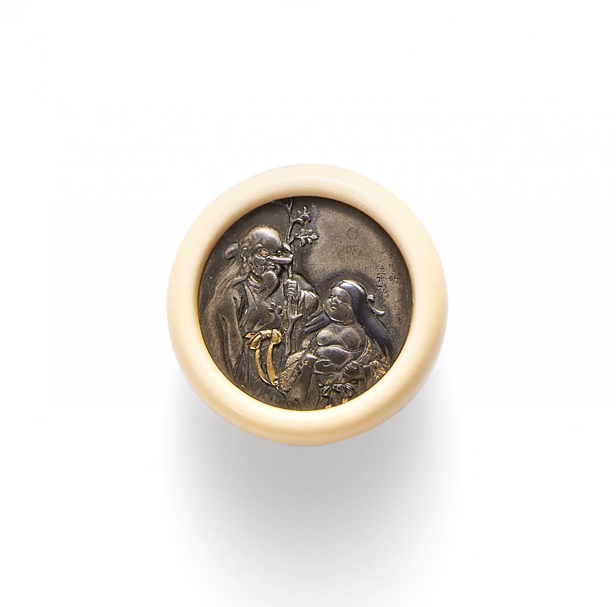 Beschreibung: In kräftigem, teils weichem Relief mit Shakudô, Gold und Silber Halbfiguren des