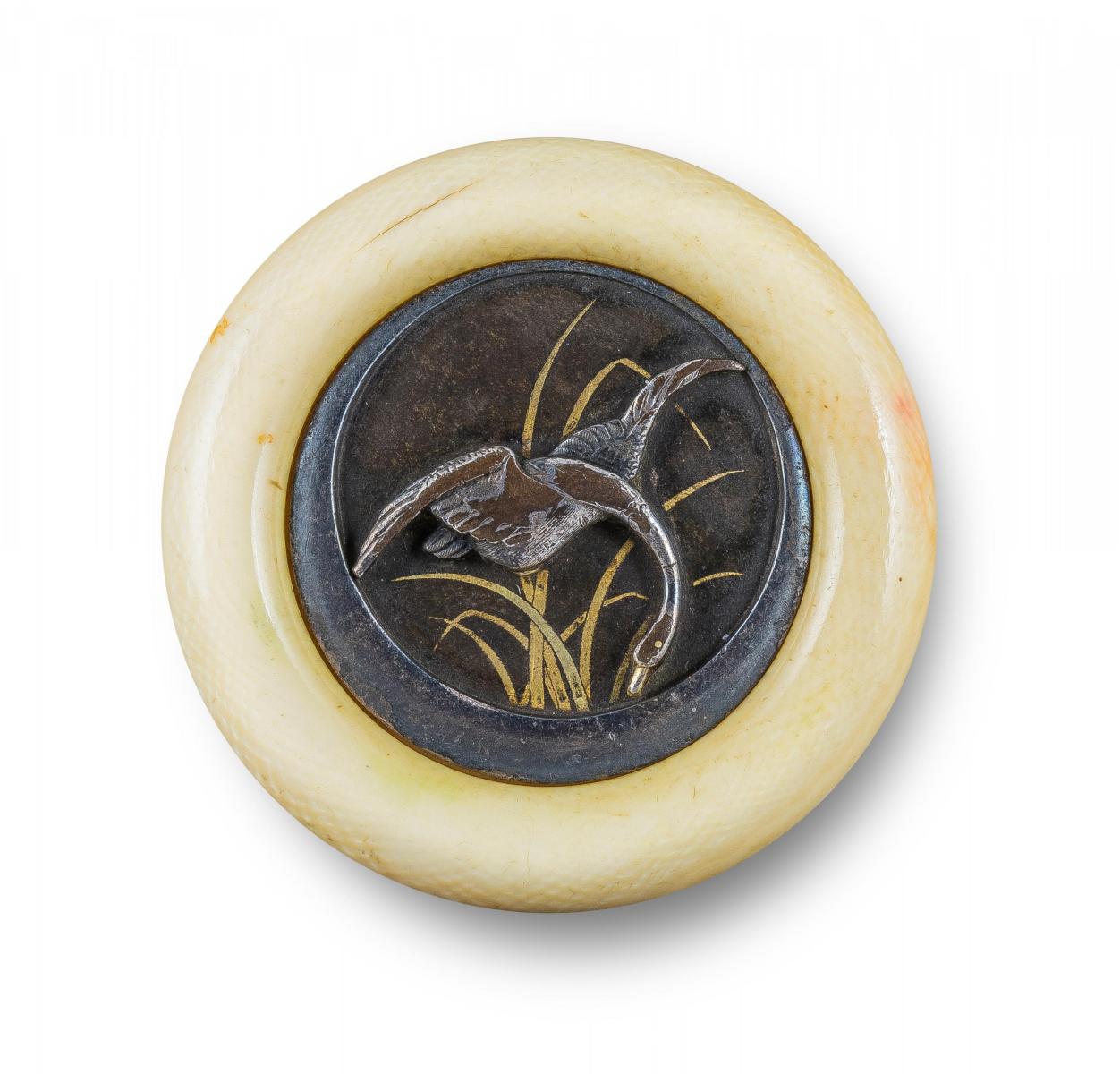 Technik: Kapsel Elfenbein, Platte Shibuichi mit Details in Gold und Silber.