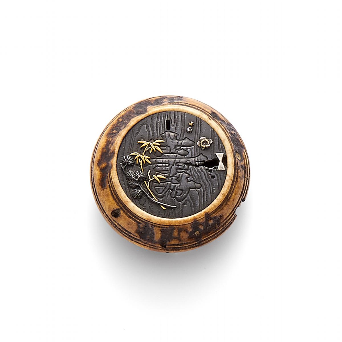 'Kotobuki' und Bambus-Zweig in Gold und Kiefern-Zweig in Shakudô mit silbernen