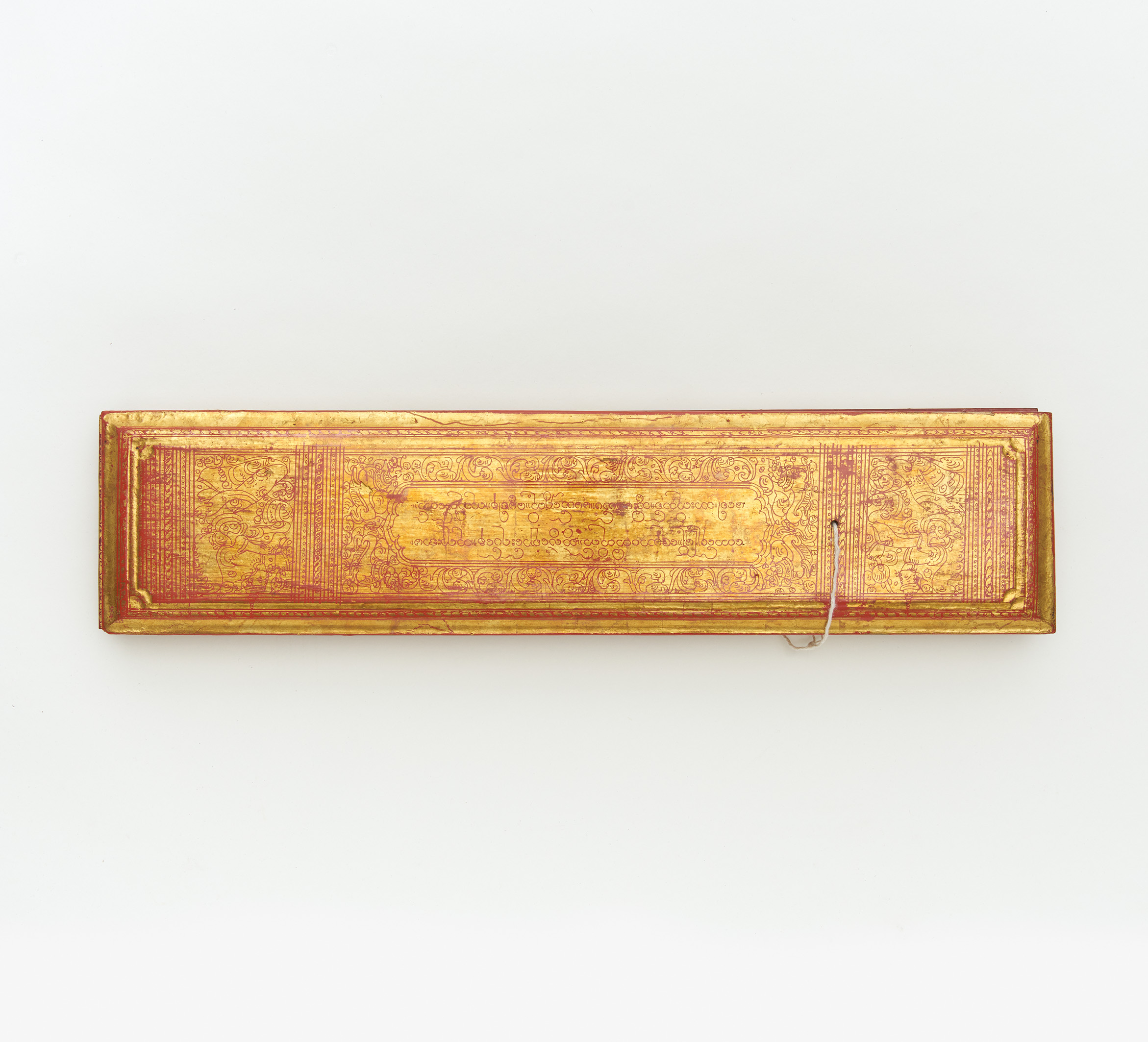 Technik: Lack mit Blattgold, 16 Blätter mit "Tamarinden"-Schrift in braunem Lack. Paar Deckblätter in Holz, vergoldet und mit Aufschrift.