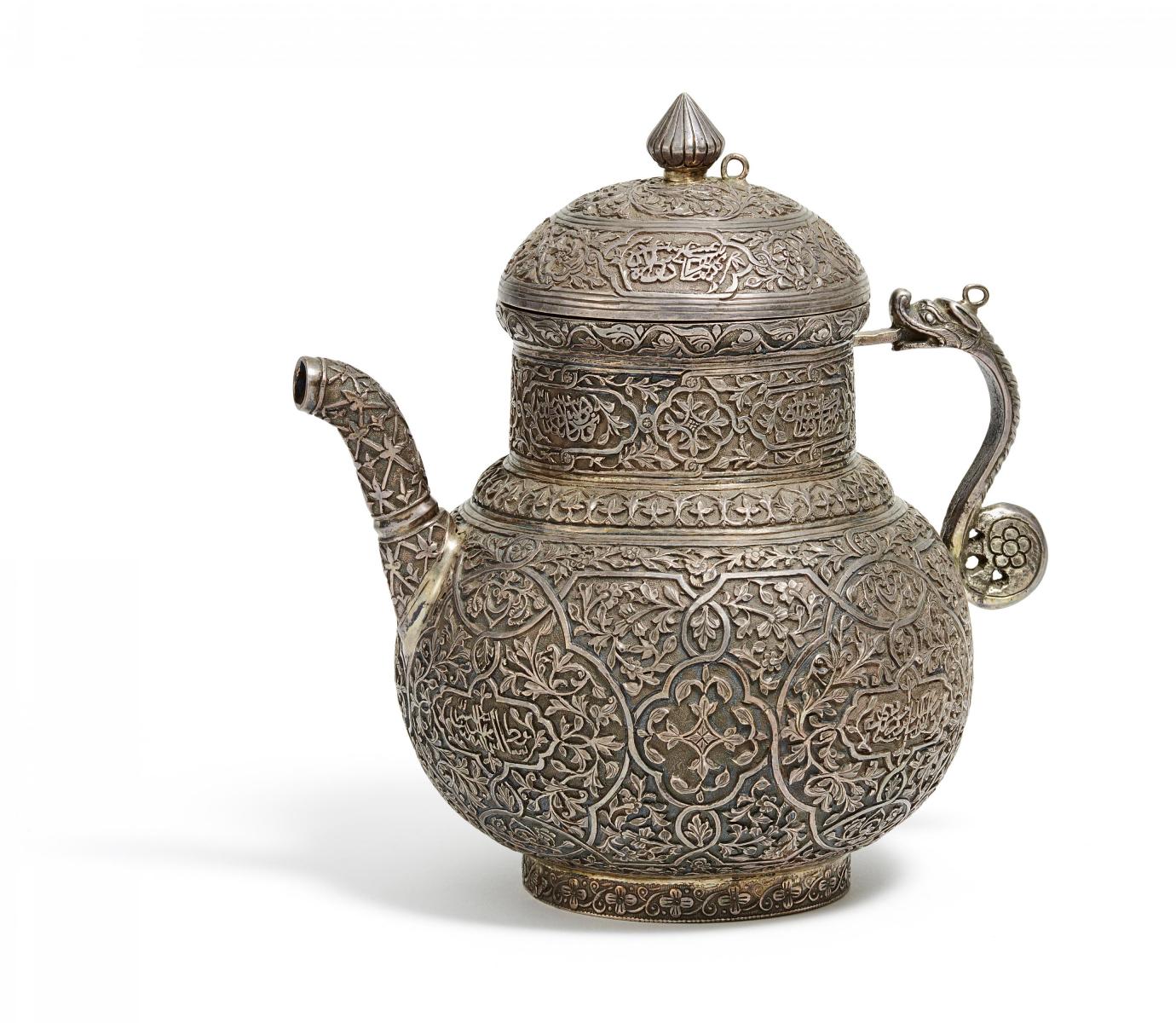 Tülle und Handhabe in Form eines Drachen. Die Oberfläche überzogen mit Blätterranken, die