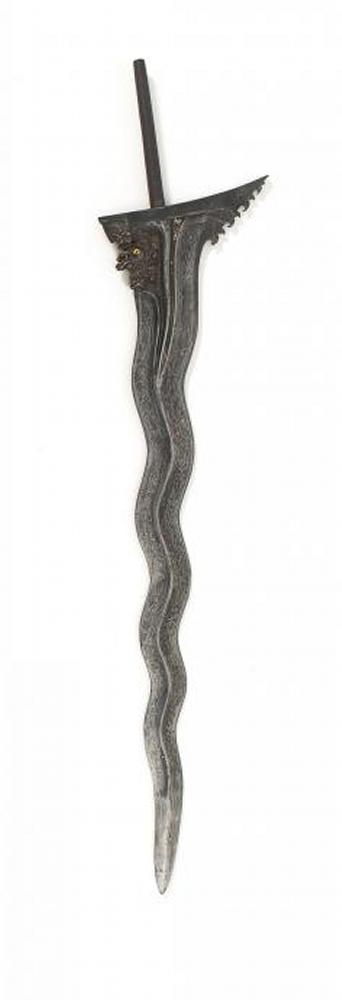 Beschreibung: Carang soka mit 9 luk, pamor mlumah beras wutah mit Naga, Zunge und Barten aus Golddraht.