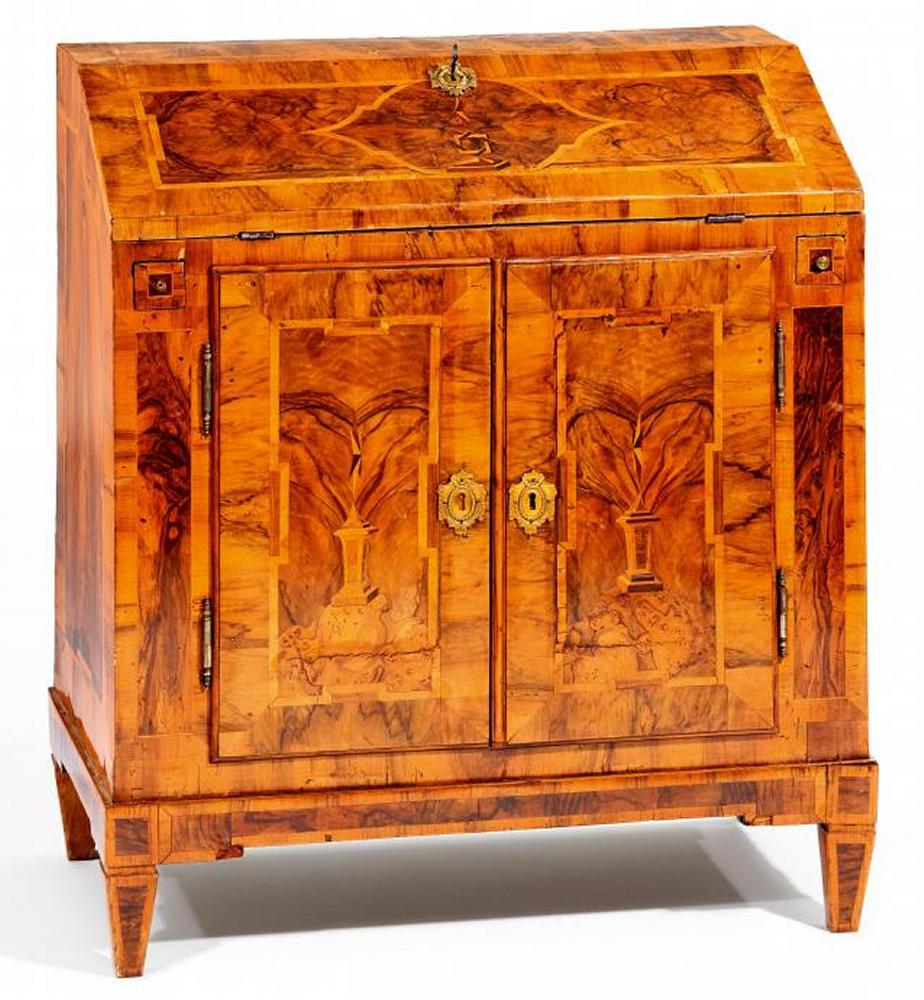 Pultstützen. Schreibfach mit schräg gestellter Platte. Innenausbau mit vier kleinen