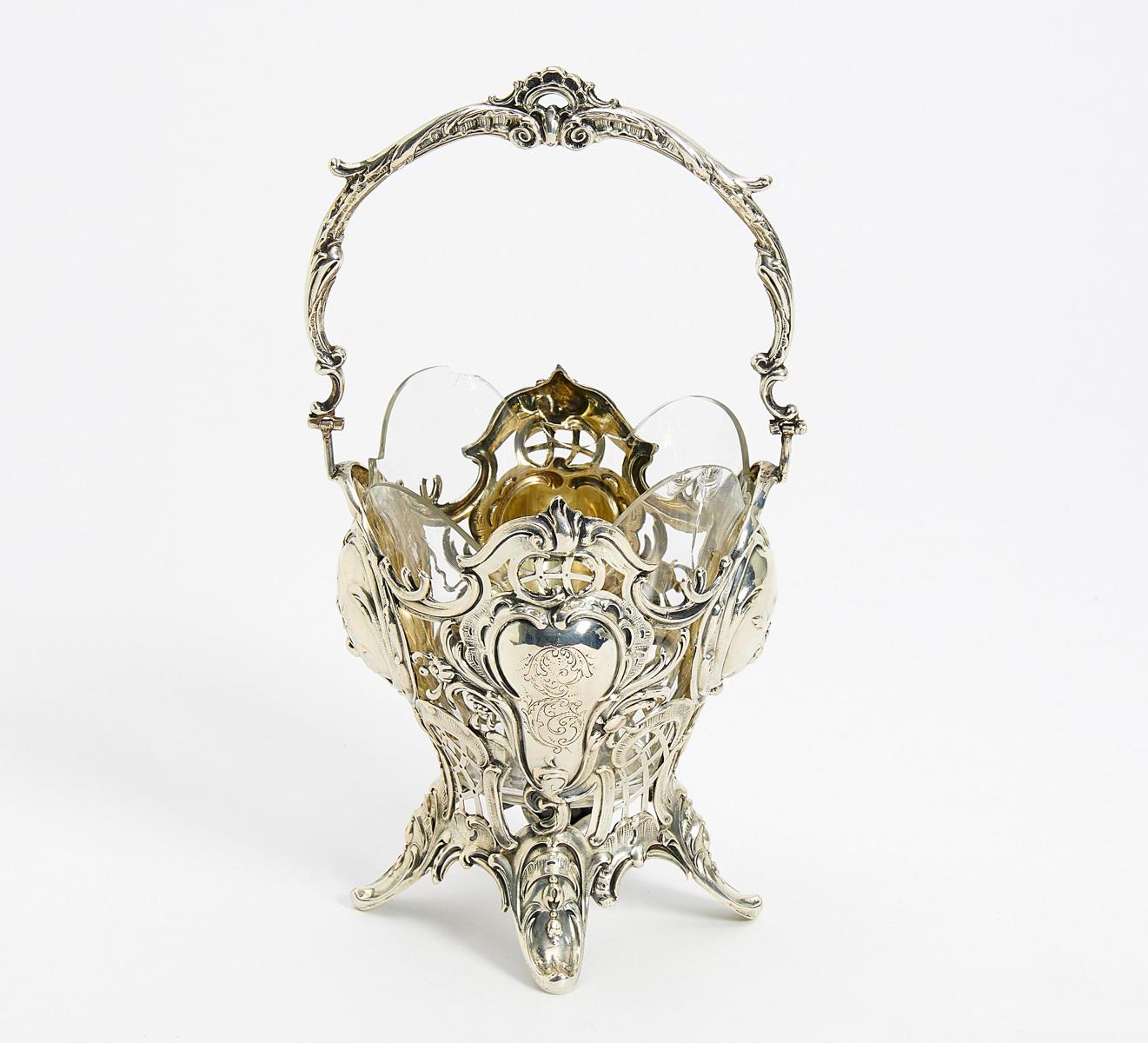 KLEINE AUFSATZSCHALE MIT BÜGELHENKEL UND GLASEINSATZ STIL ROKOKO.