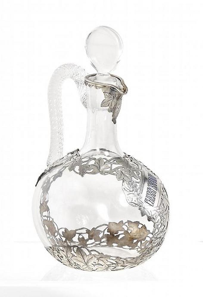 Glaskorpus mit Silbermontierung und blauer Emailschrift. Auf der Schauseite Tafel mit Inschrift 'Cherry Brandy' zwischen Weinlaubdekor. Höhe 19cm.