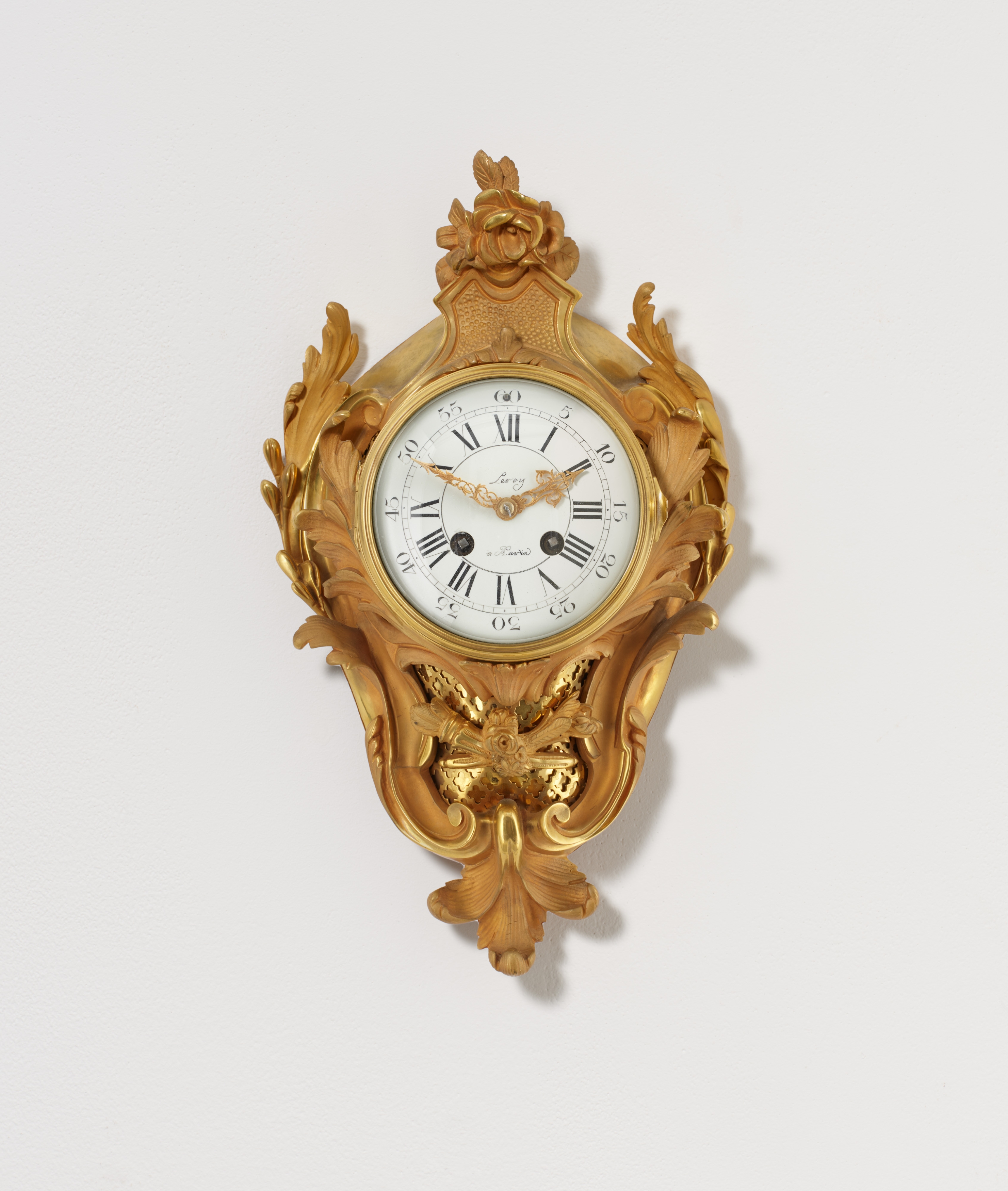 Emailzifferblatt mit römischen Stunden und arabischer Minuterie. Pendulewerk mit Federaufhängung und Halbstundenschlag auf Glocke. .