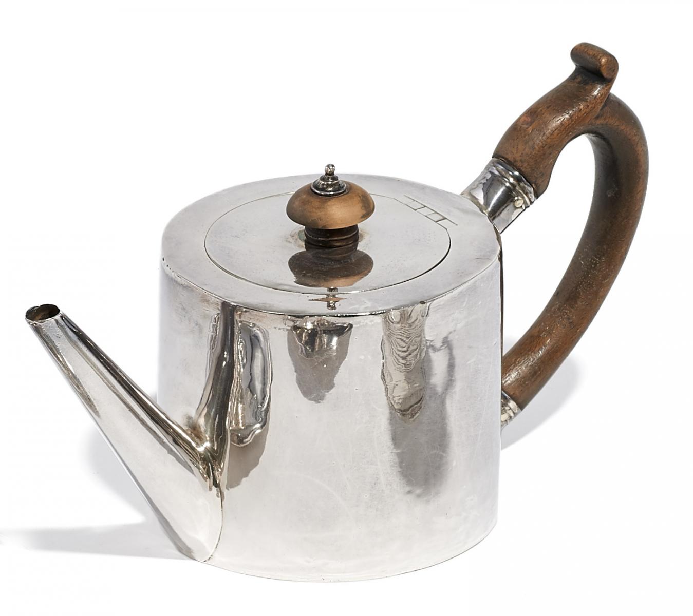 Silber. Holzhenkel und -knauf. Auf Wandung verputzte heraldische Gravur. Ca. 306g. Höhe 12cm.