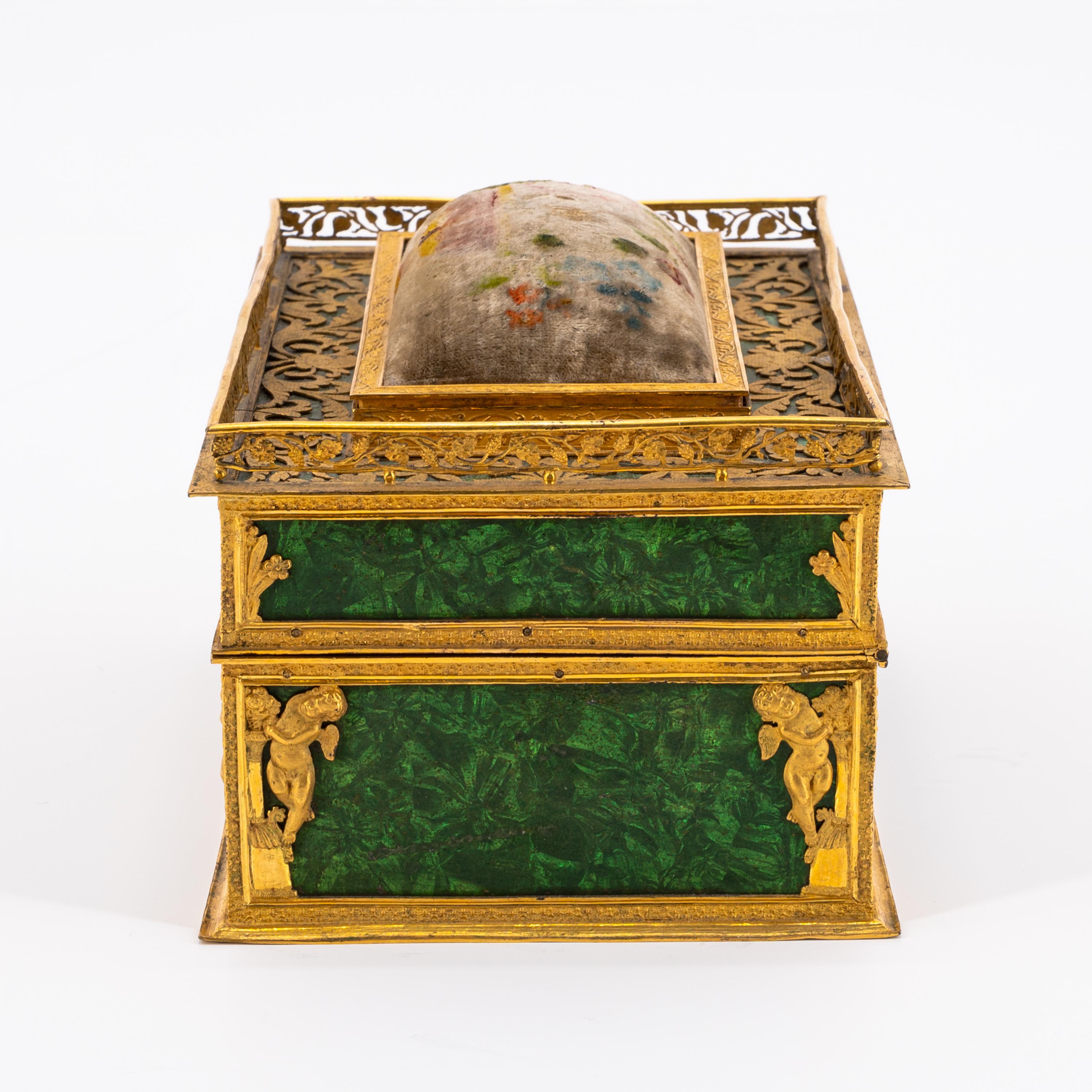 Technik: Metall, wohl Zink mit Kristallmuster, grün lackiert Metall feuervergoldet Samt, Innen mit rosefarbener Seide ausgeschlagen Deckelinnenseite mit Spiegel .