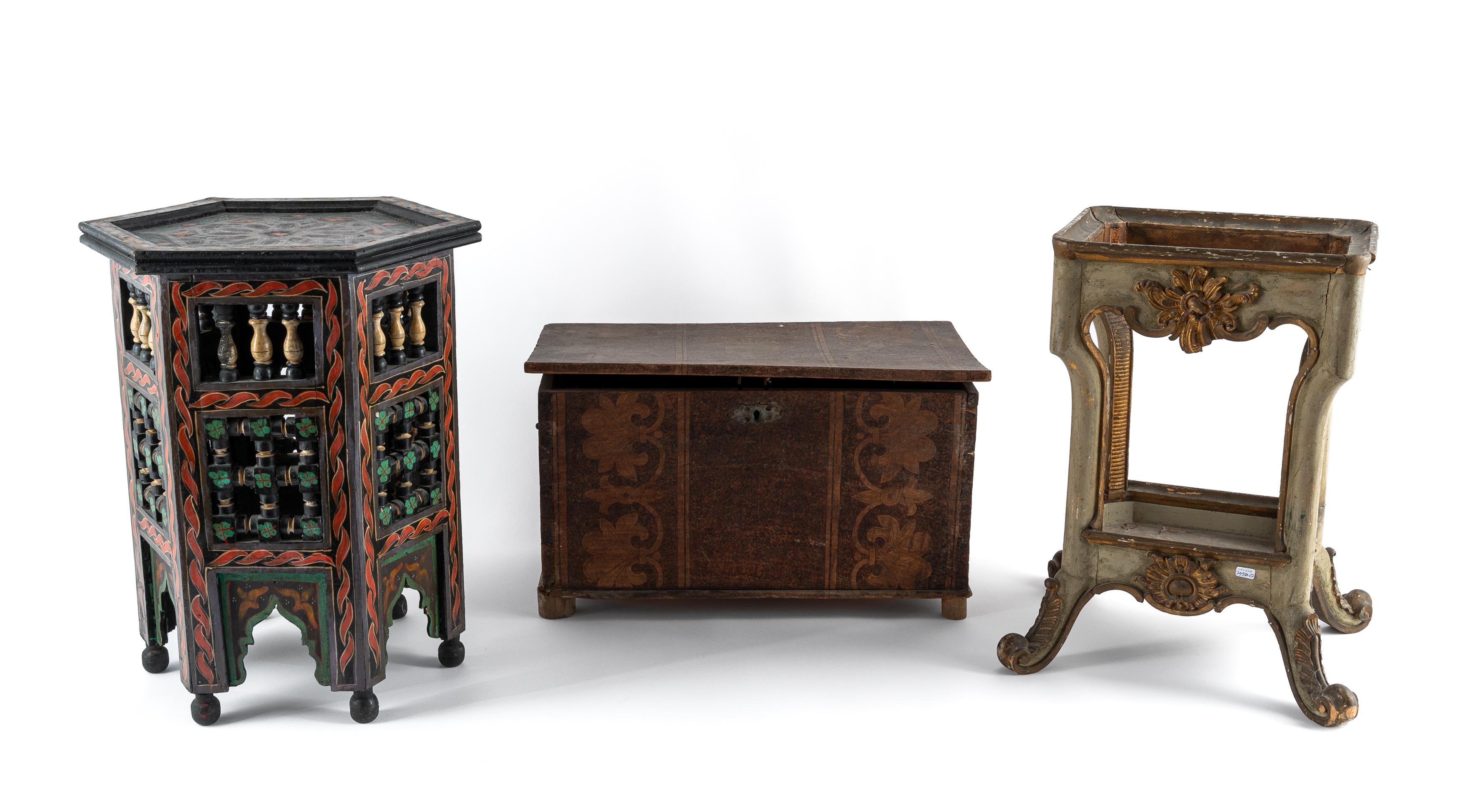 KLEINE HOLZSCHATULLE, BEISTELLTISCH IM ORIENTALISCHEM STIL, BLUMENSTÄNDER.