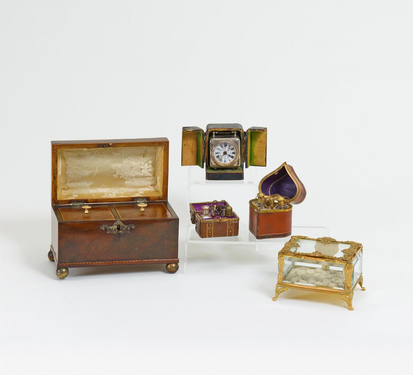 KLEINE HOLZSCHATULLE, KLEINE KRISTALLSCHATULLE, 2 NÄHSETS, 1 KLEINER REISEWECKER.