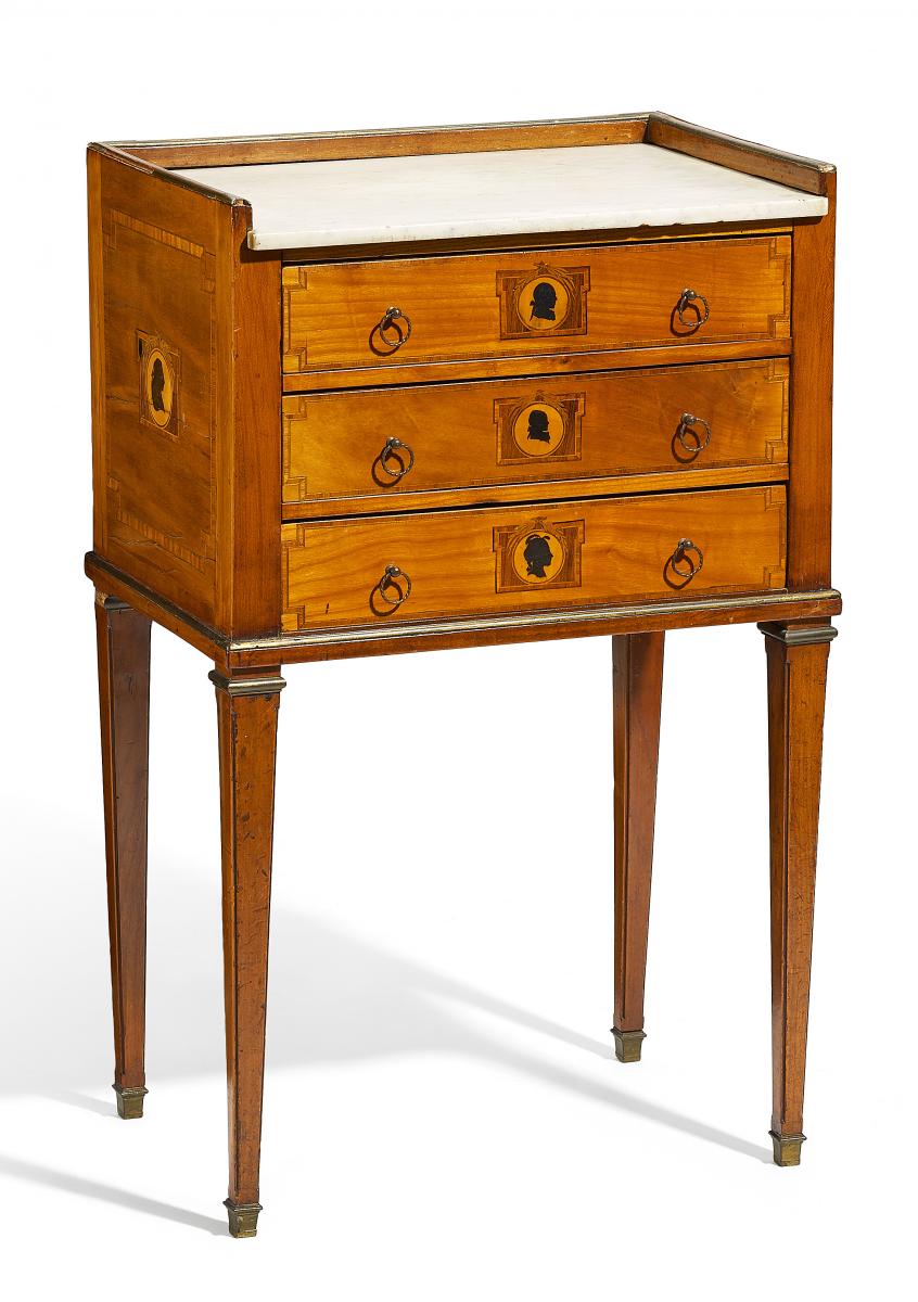 Kirschbaum, Palisander, Ahorn und ebonisiertes Holz eingelegt. Marmorplatte. Rechteckiger gerader Korpus mit drei Schüben auf konischen Vierkantbeinen. Auf den Schüben