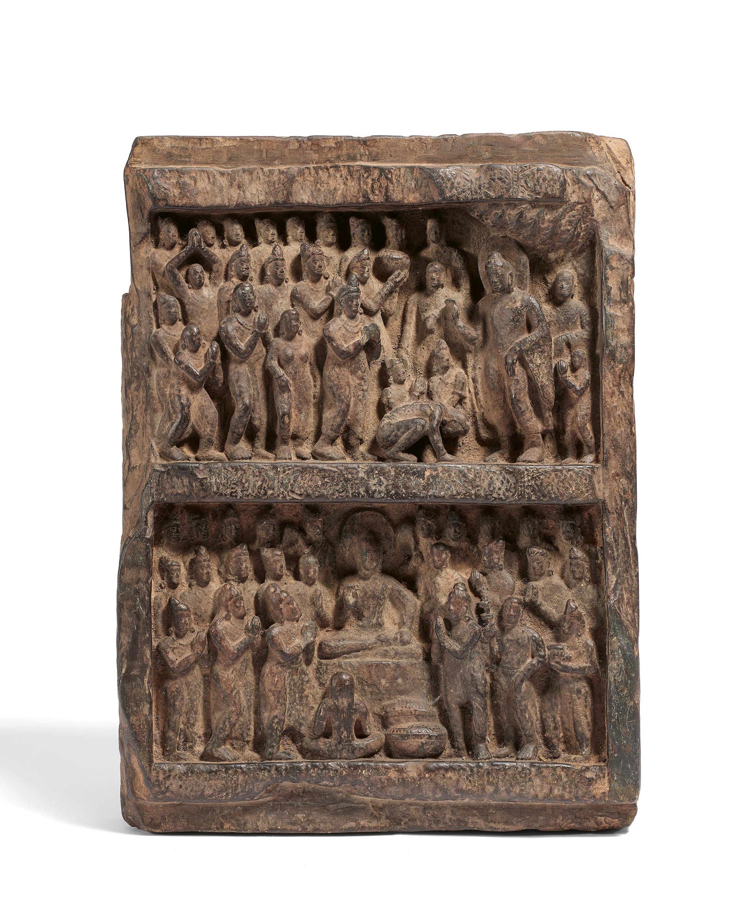 KLEINE RELIEFPLATTE MIT ZWEI SZENEN DES BETENDEN BUDDHAS.