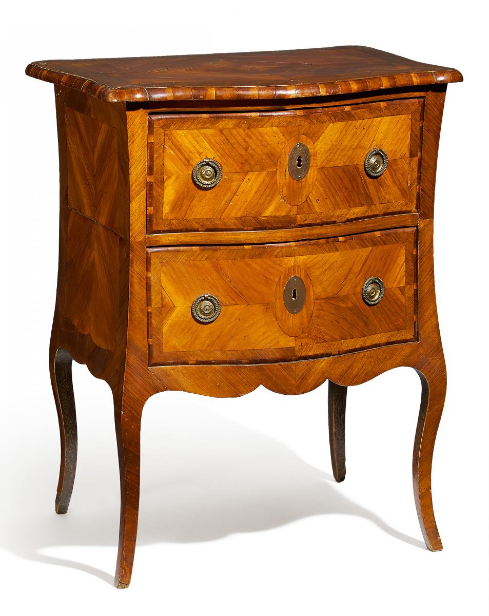 Pflaume, Nussbaum. Zweischübiger, leicht geschweifter Korpus auf hohen geschwungenen Beinen. 85x68x47 cm. Zustand B/C.
