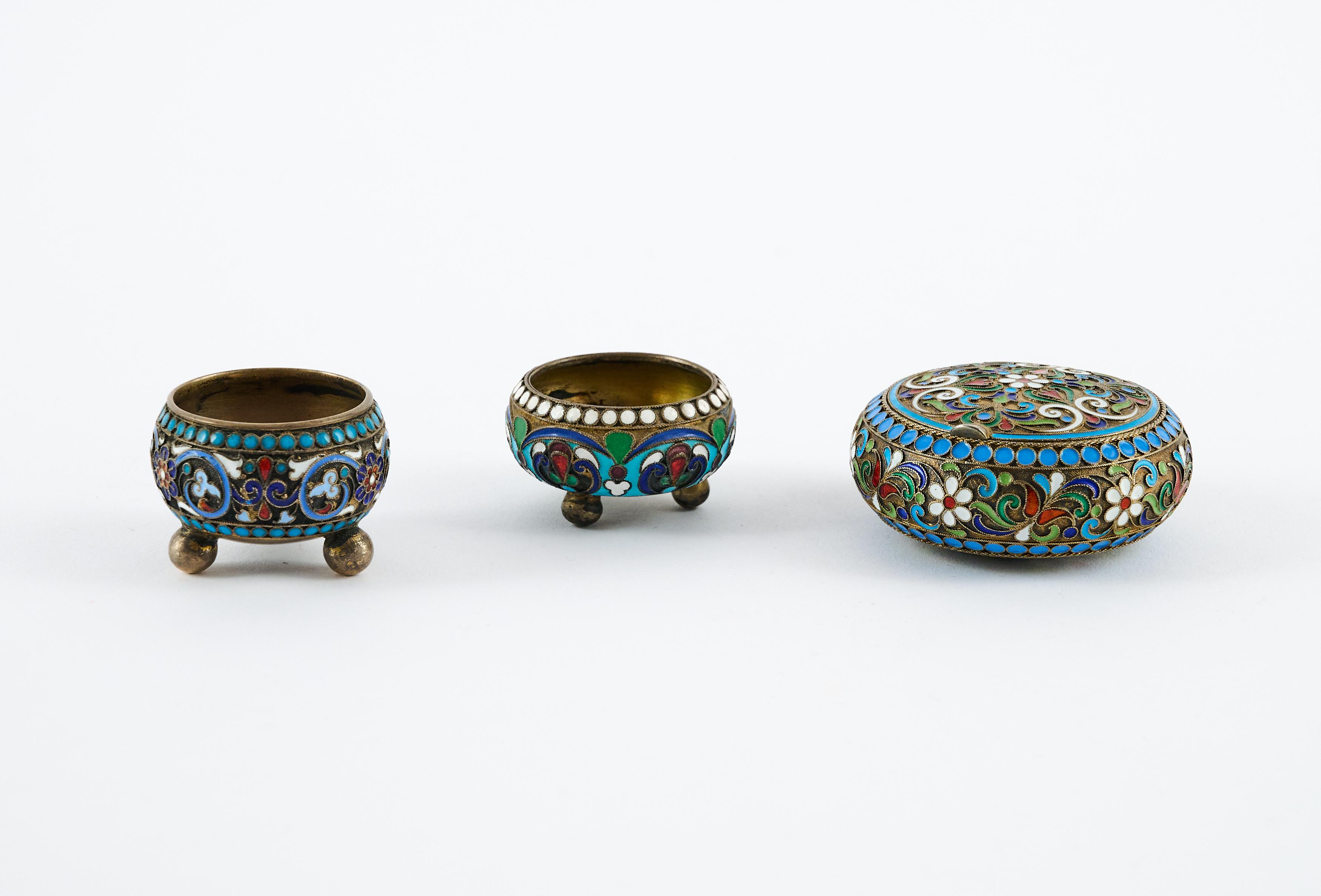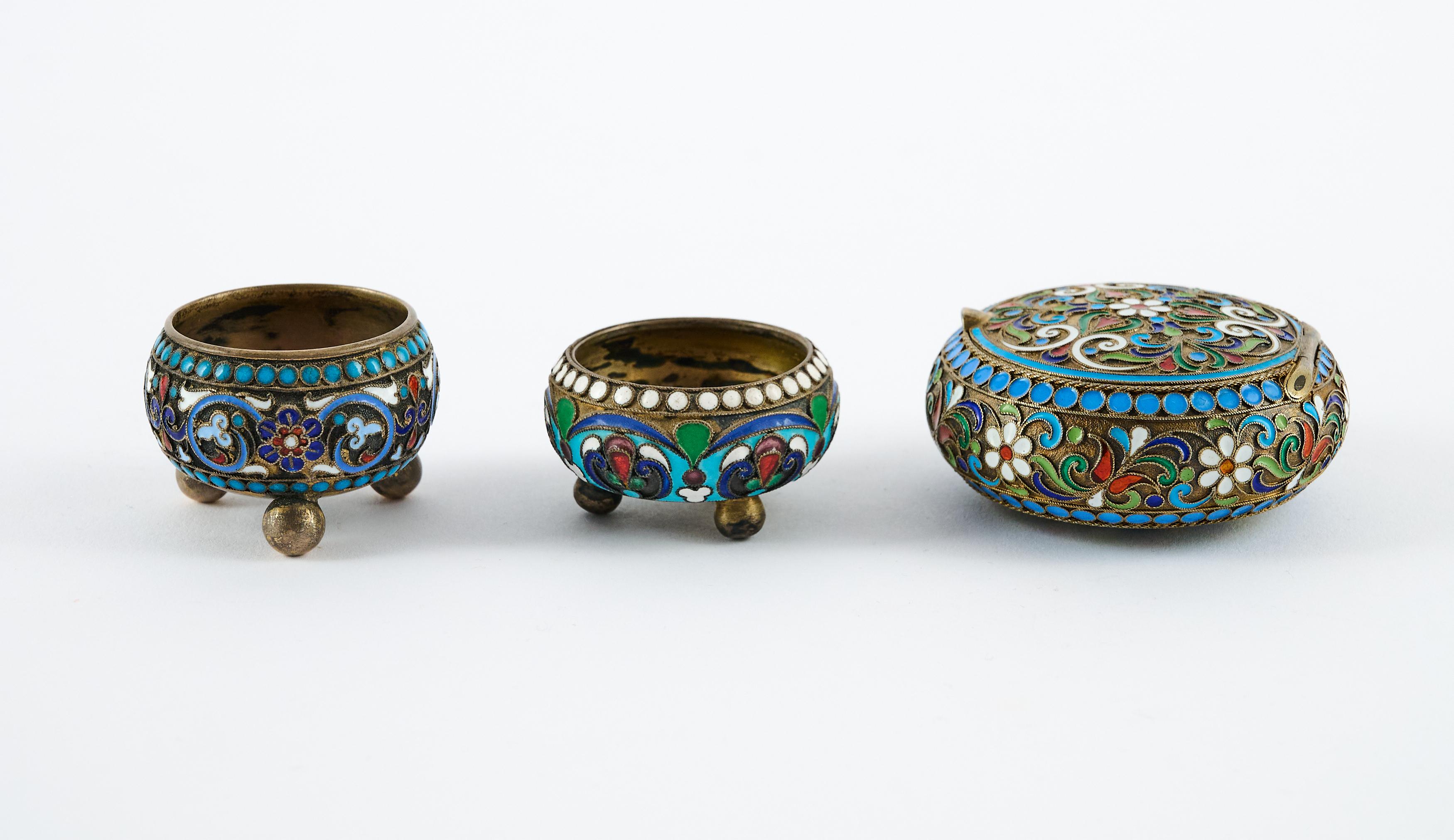 KLEINE RUNDE DOSE UND ZWEI KLEINE SALZGEFÄßE MIT FARBIGEM EMAILDEKOR.