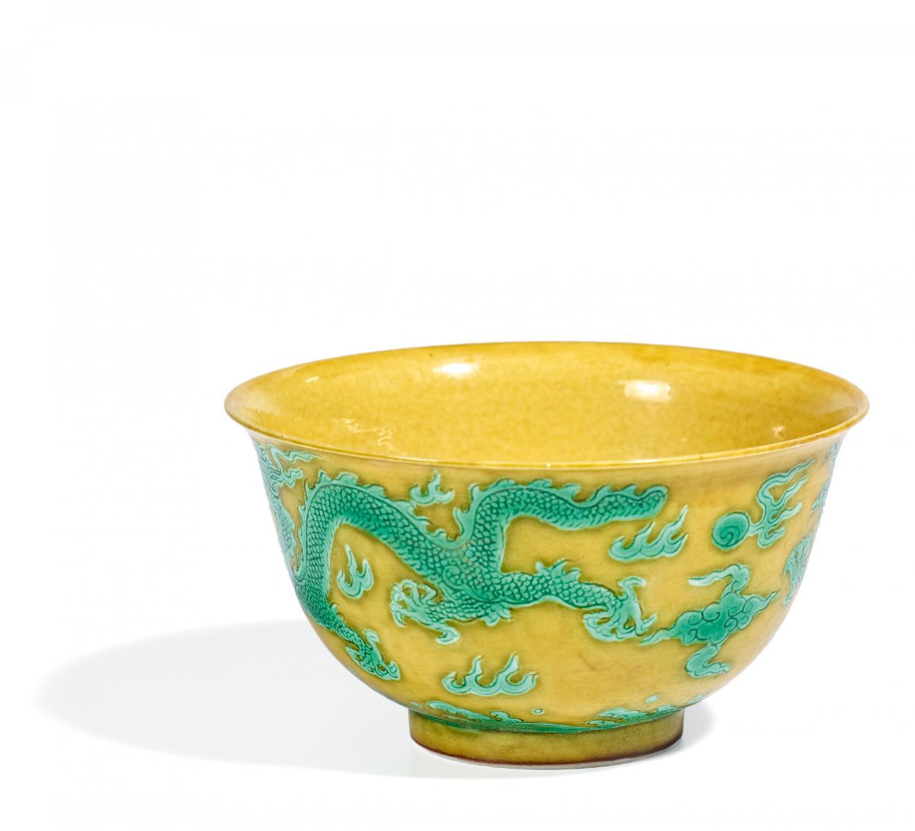 Technik: Porzellan, graviert mit gelber und grüner Glasur.