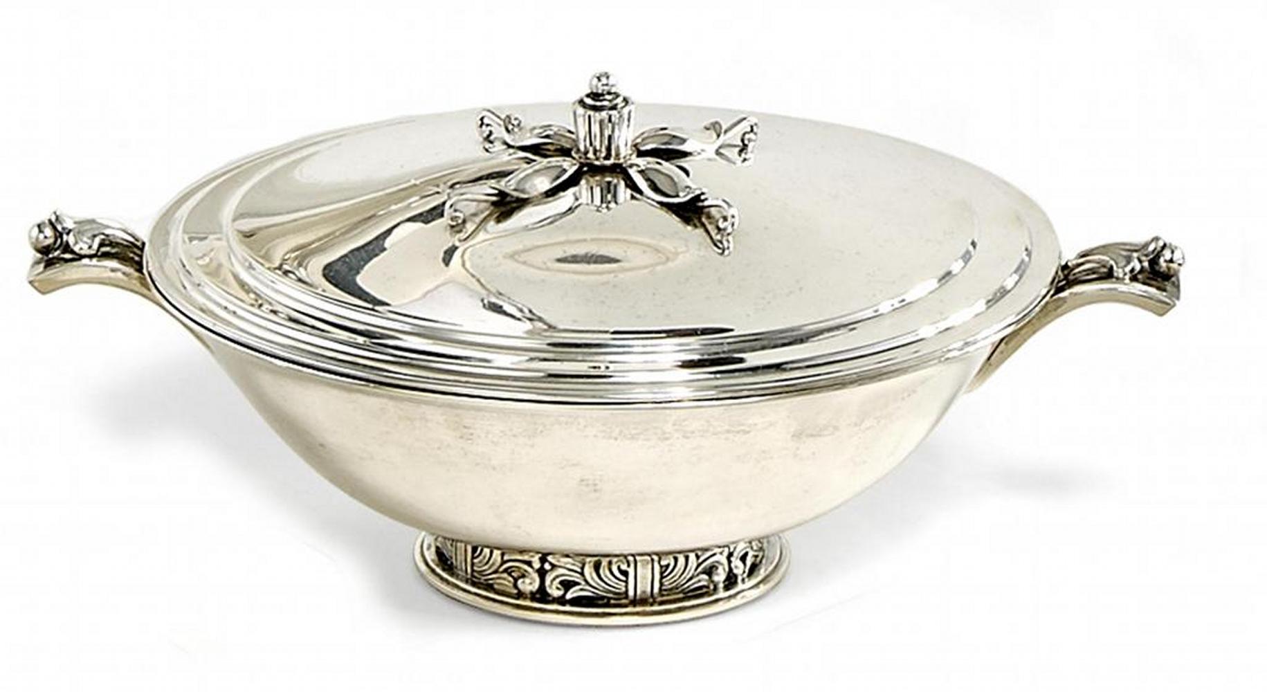 Silber. Stülpdeckel mit zweifach eingestuftem Rand und zylindrischem, auf Blättern ansetzendem