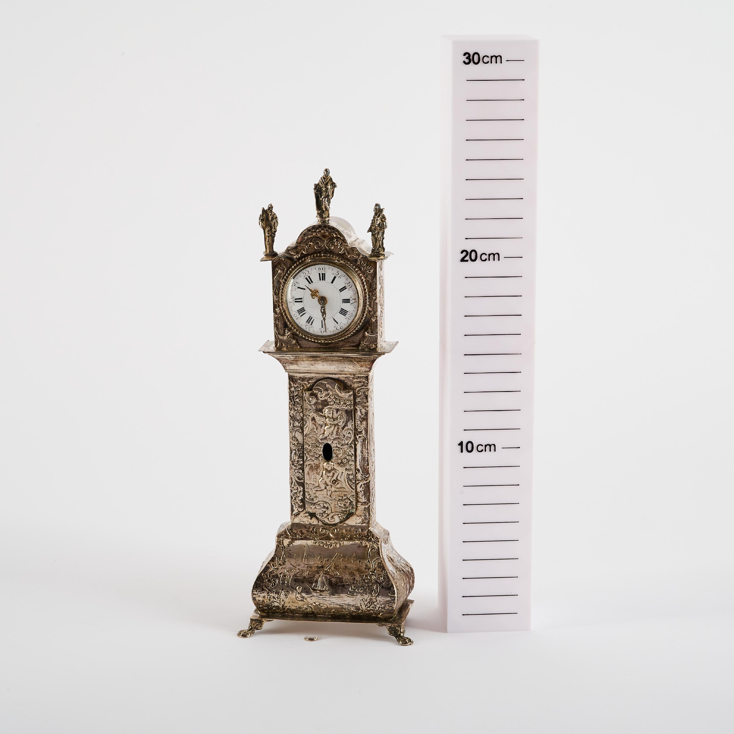 KLEINE TISCHUHR IN FORM EINER BODENSTANDUHR MIT REICHEM RELIEFDEKOR
