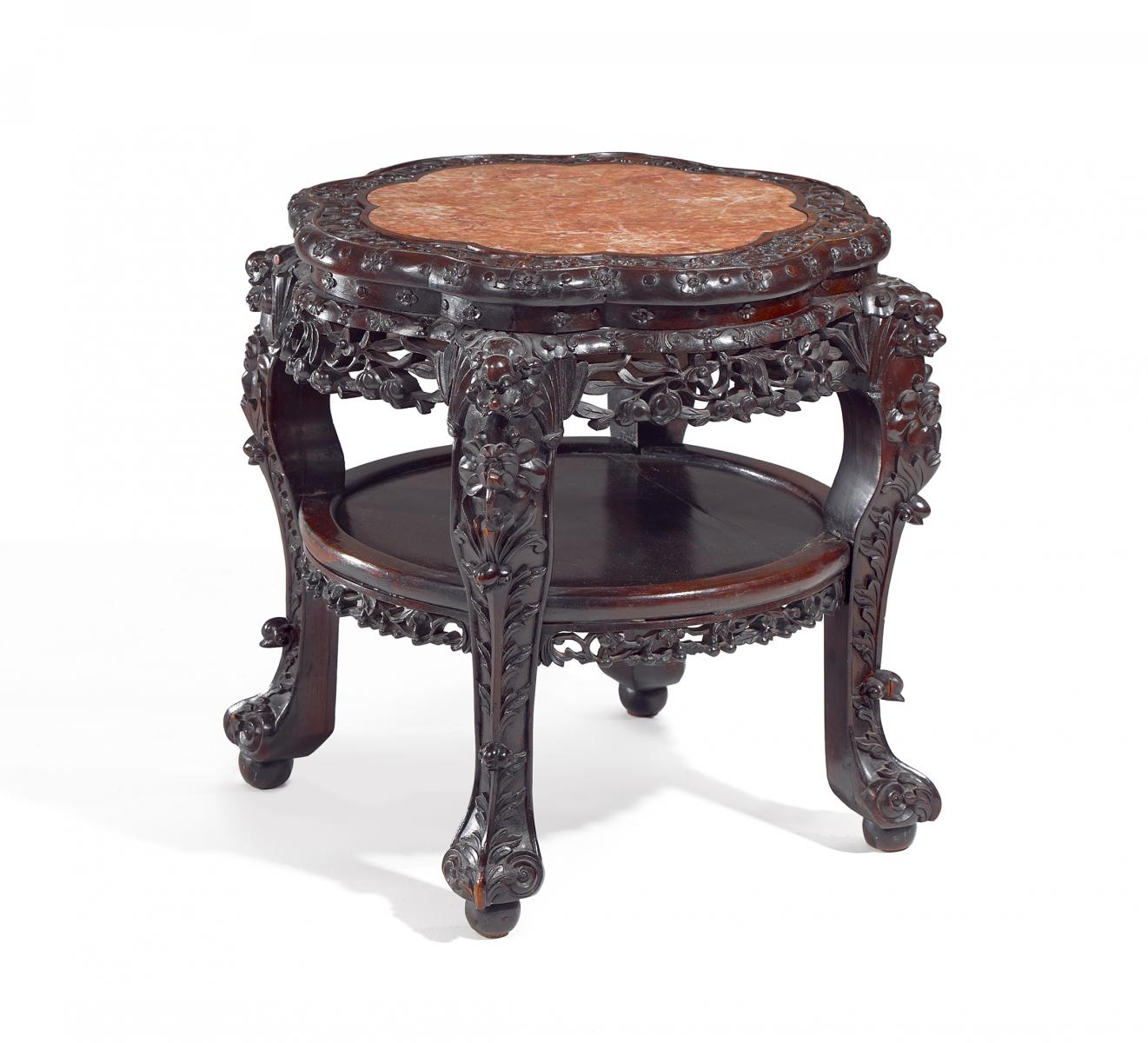 Technik: Dunkles Hartholz, Einlageplatte rötlicher Marmor.