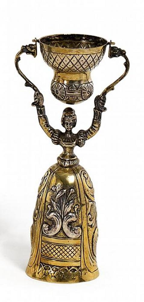 Silber mit Teilvergoldung. Trinkspiel. Frauenfigur mit als Gefäß dienendem Glockenrock. Ca. 104g. Höhe 13,5cm.