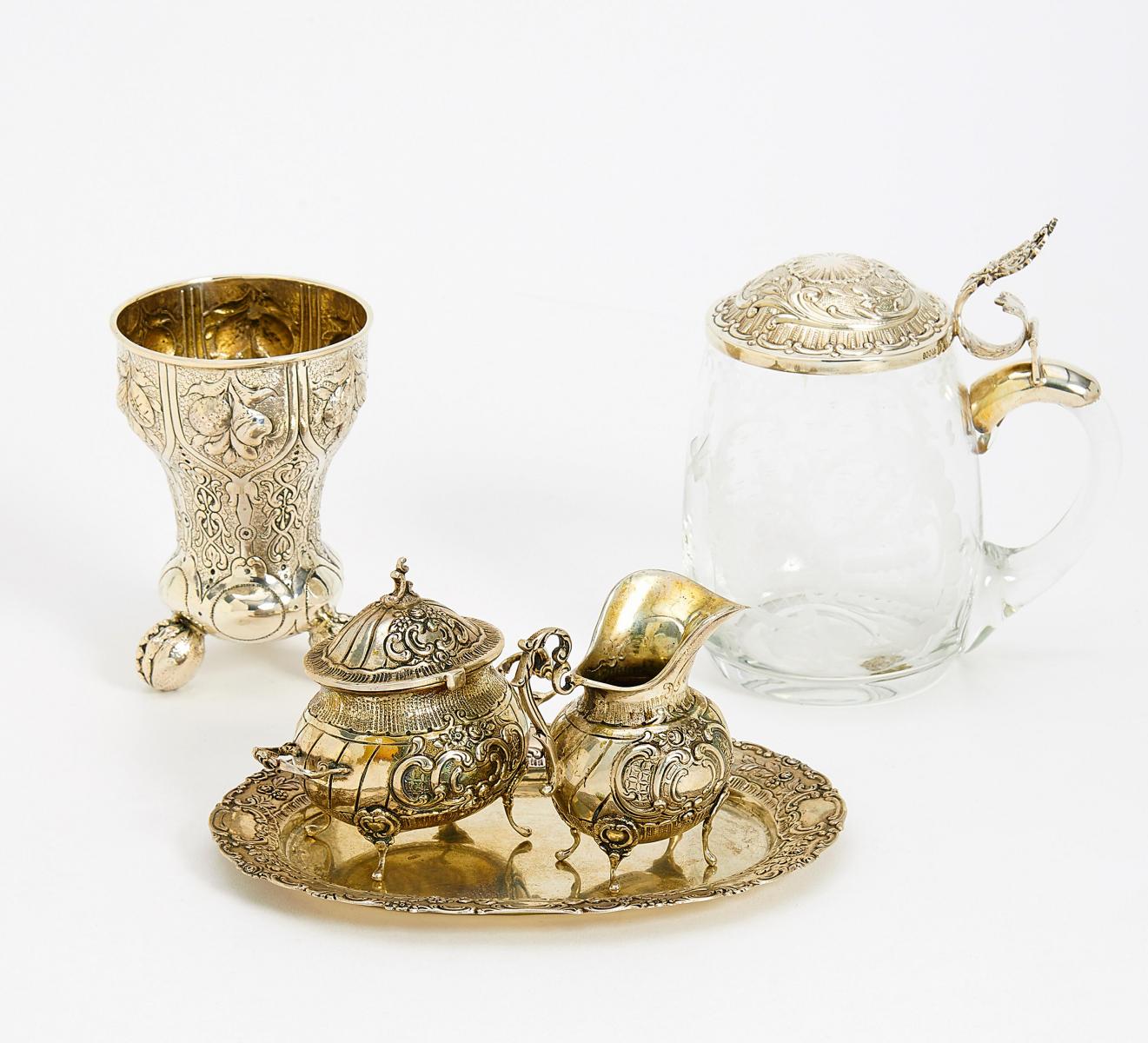 KLEINER DECKELHUMPEN, BECHER, MILCHKÄNNCHEN UND ZUCKERDOSE AUF TABLETT.