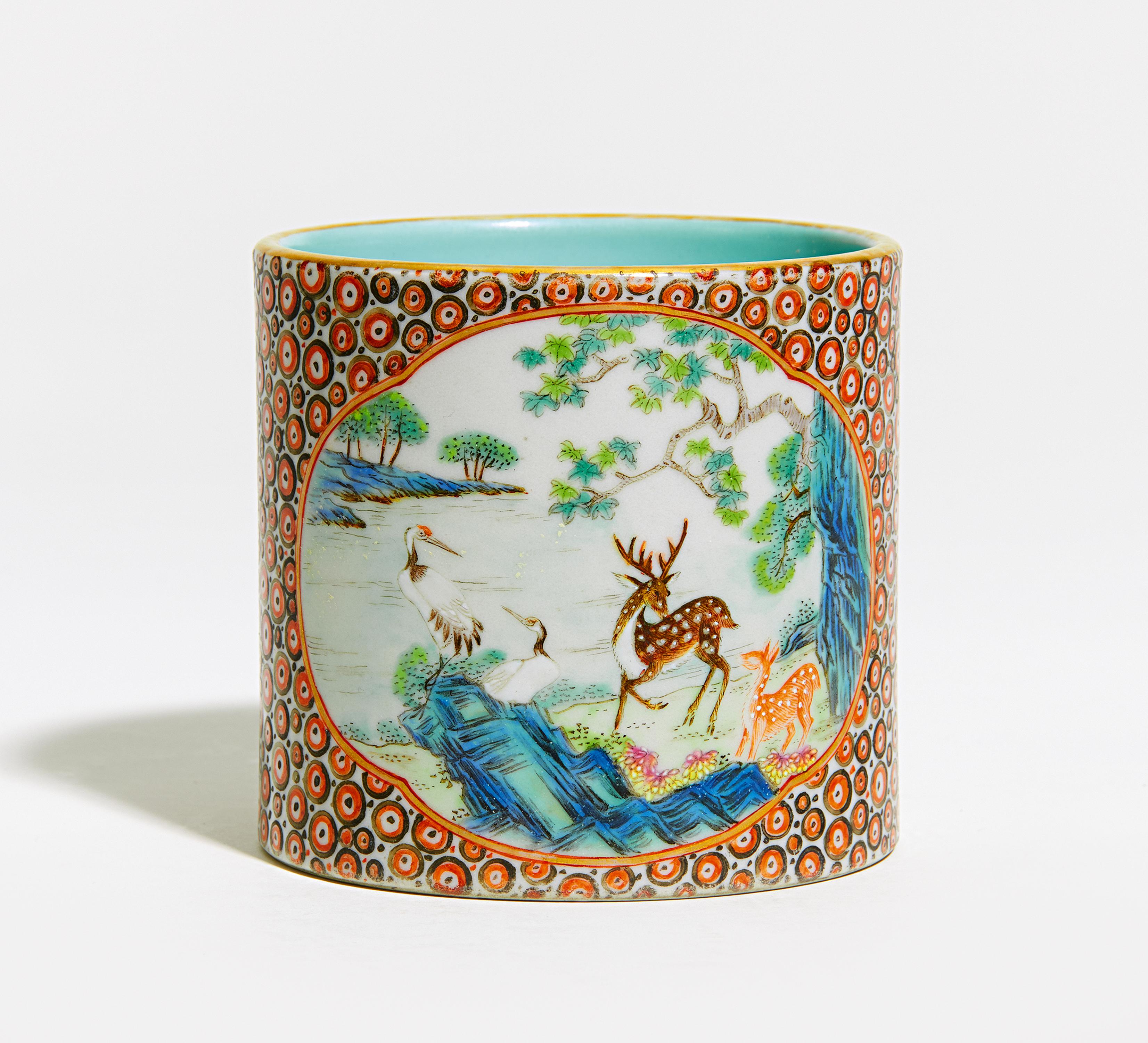 KLEINER PINSELBECHER MIT ZIEGEN UND HIRSCHEN.