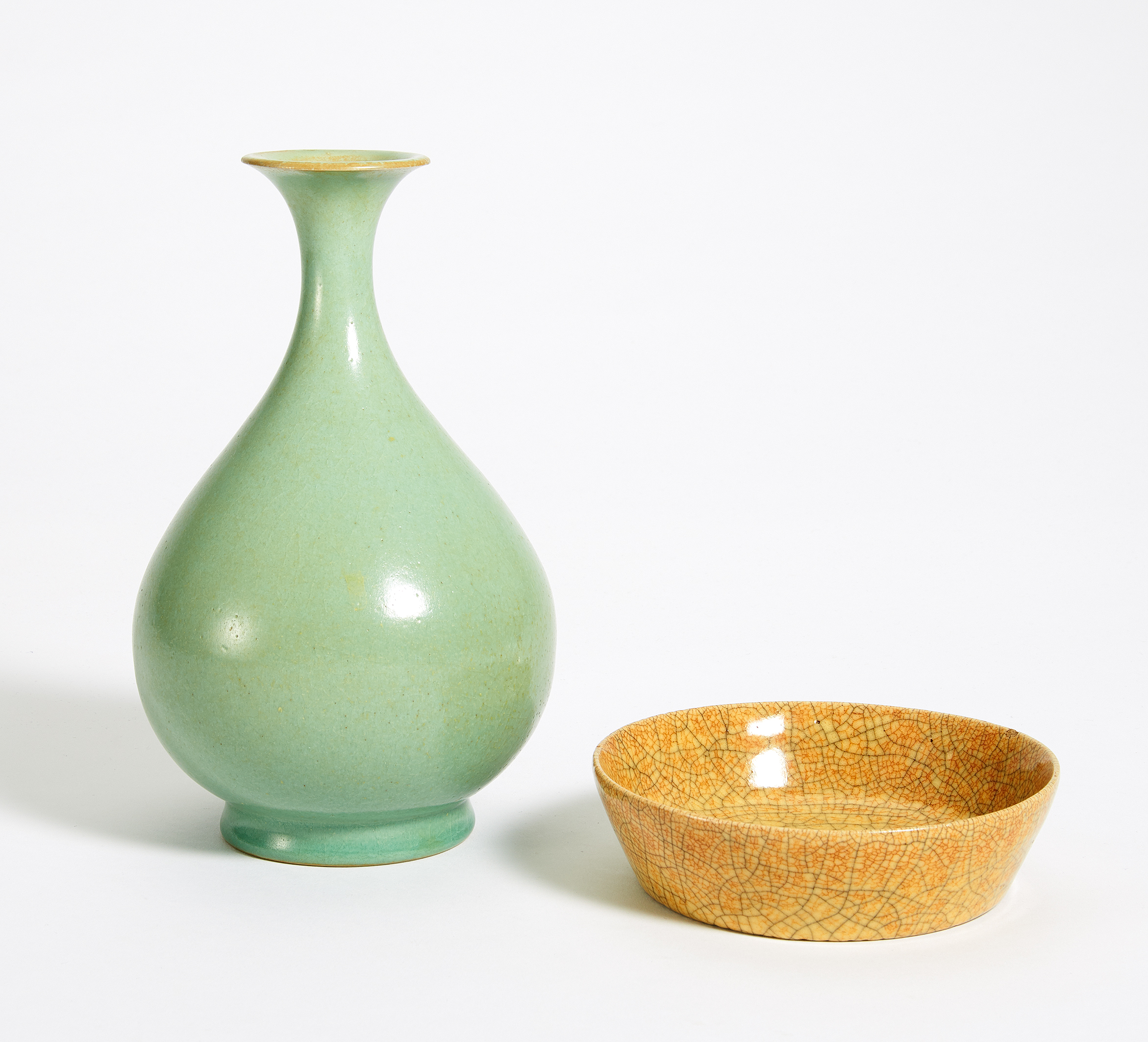 Zustand B. Beilage: Vase in Yuhuchun-Form. China. Seladon-Keramik. H.21cm. Unterseitig fünf Brandstützen.
