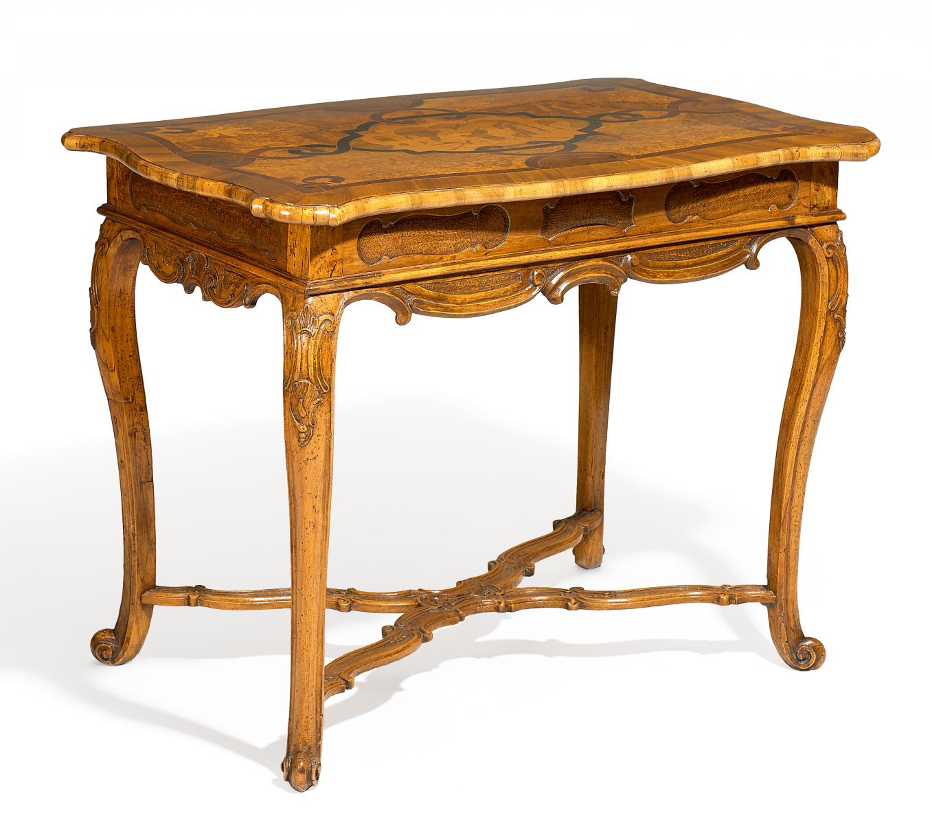 Nussbaum und Obsthölzer poliert und eingelegt. Rechteckige leicht passig geschweifte Platte auf hohen geschwungenen Beinen,