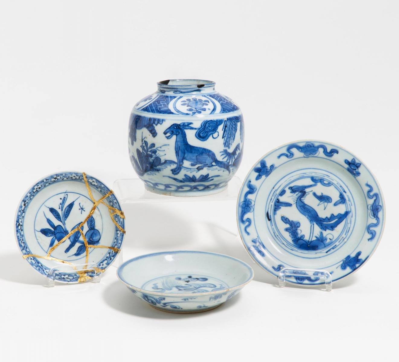 Technik: Porzellan bemalt in Unterglasurblau mit Fabeltieren und Früchten.