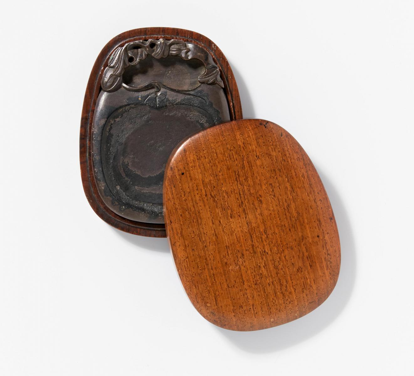 Technik: Bräunlicher Schiefer. In einer Dose aus rötlichem Hartholz.