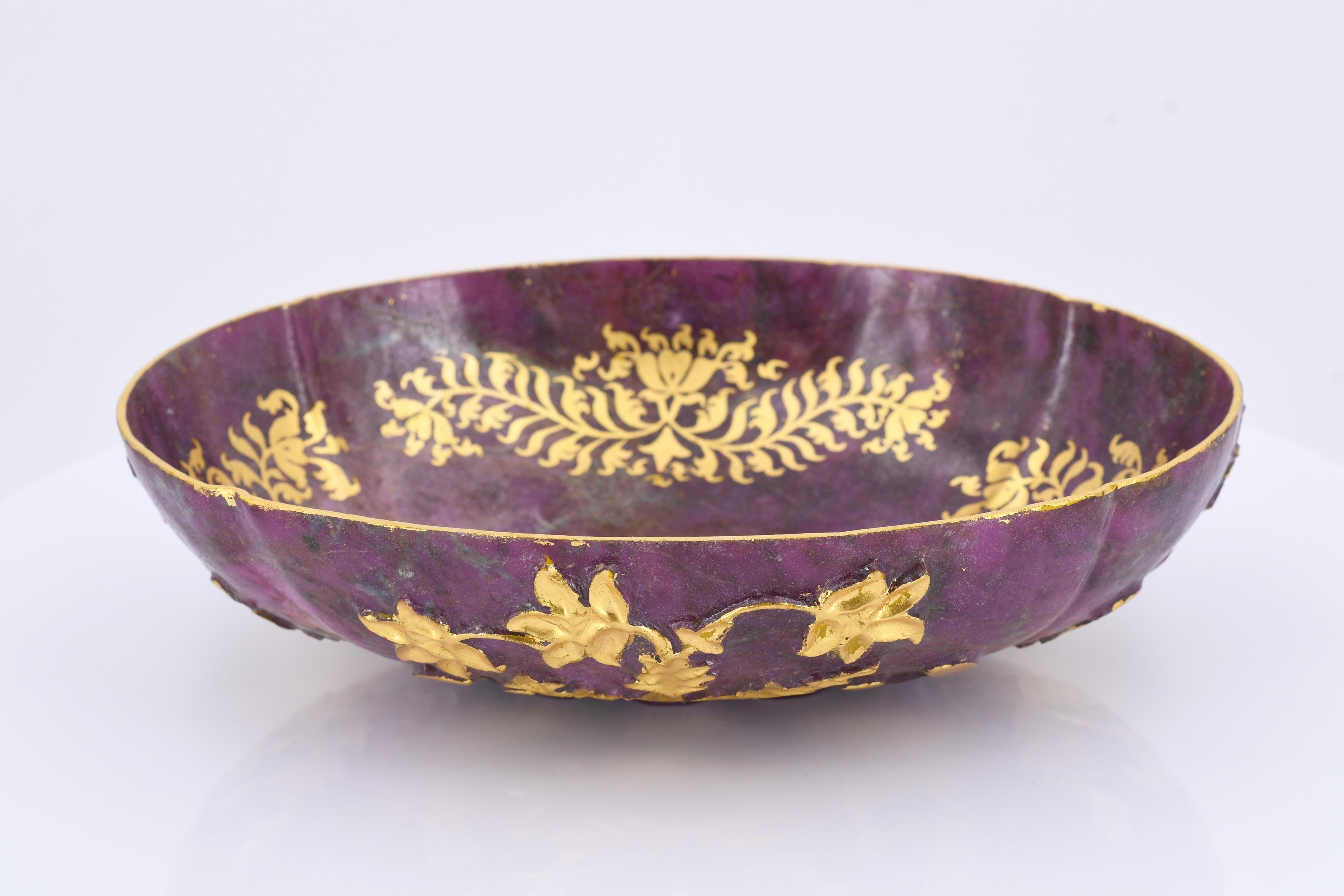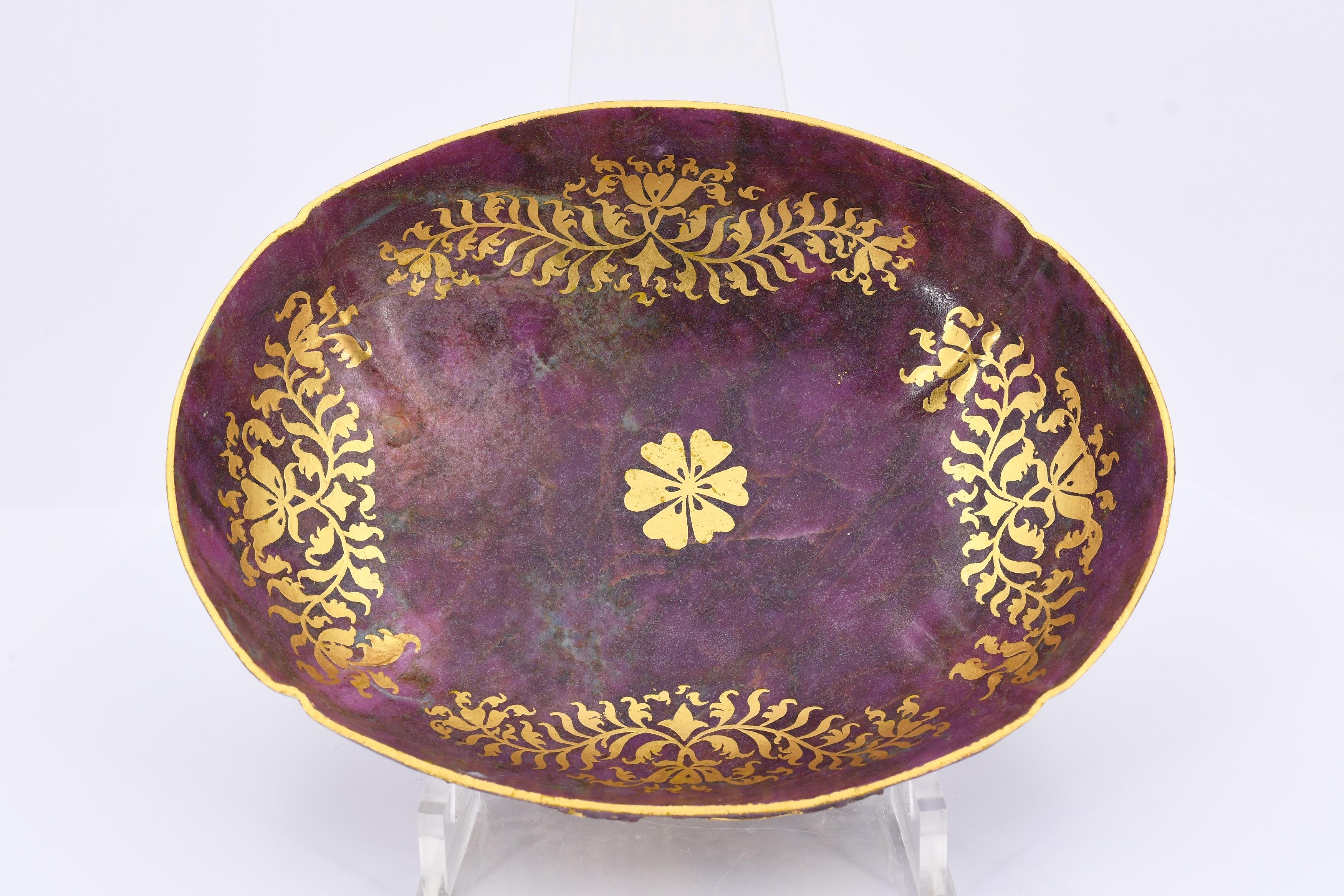 und Vögel, am Boden blütenförmiger Fuß. Alles in Gold gehöht, das Schaleninnere zusätzlich