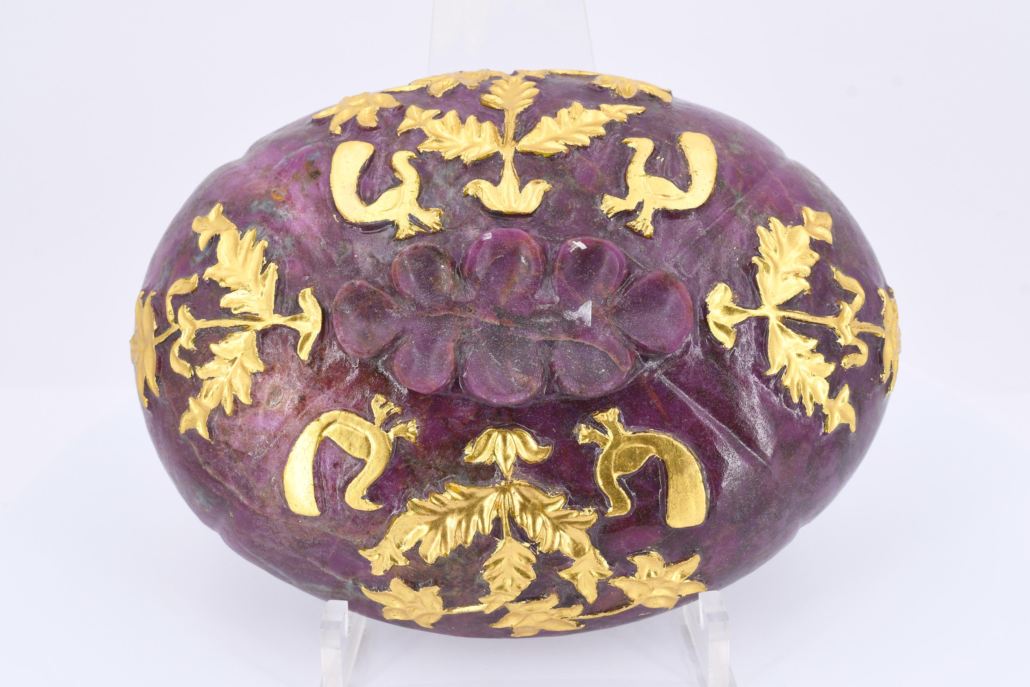 Beschreibung: Länglich passige Form. Auf der Wandung in geschnittenem Relief stilisierte Blütenranken