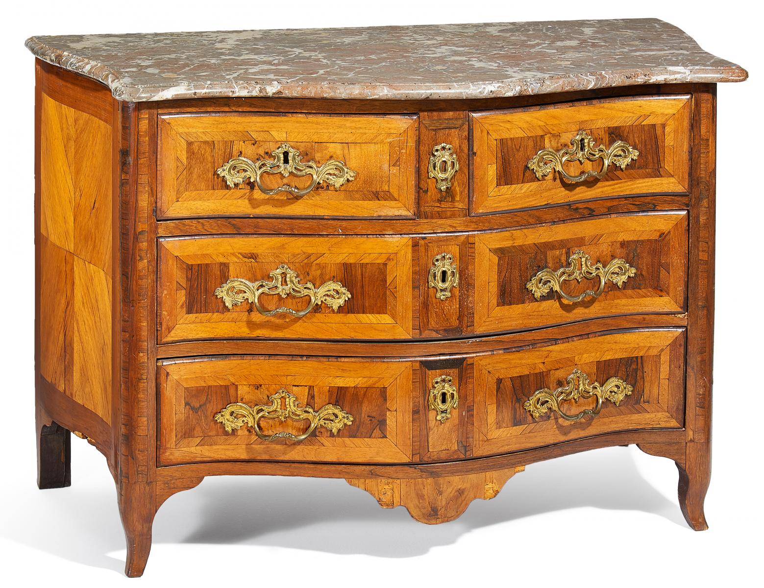 Palisander, Mahagoni, Rosenholz. Marmorplatte. Geschweifter vierschübiger Korpus. 87x131x65 cm. Zustand C.