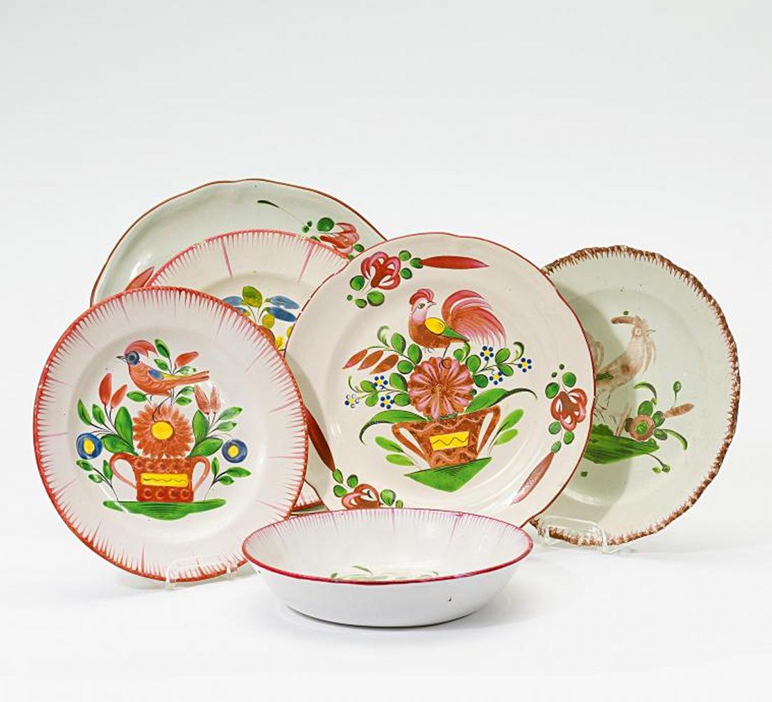 Beiger und sandfarbener Scherben, weiß glasiert, farbiges Dekor. ø 20,5-30 cm.