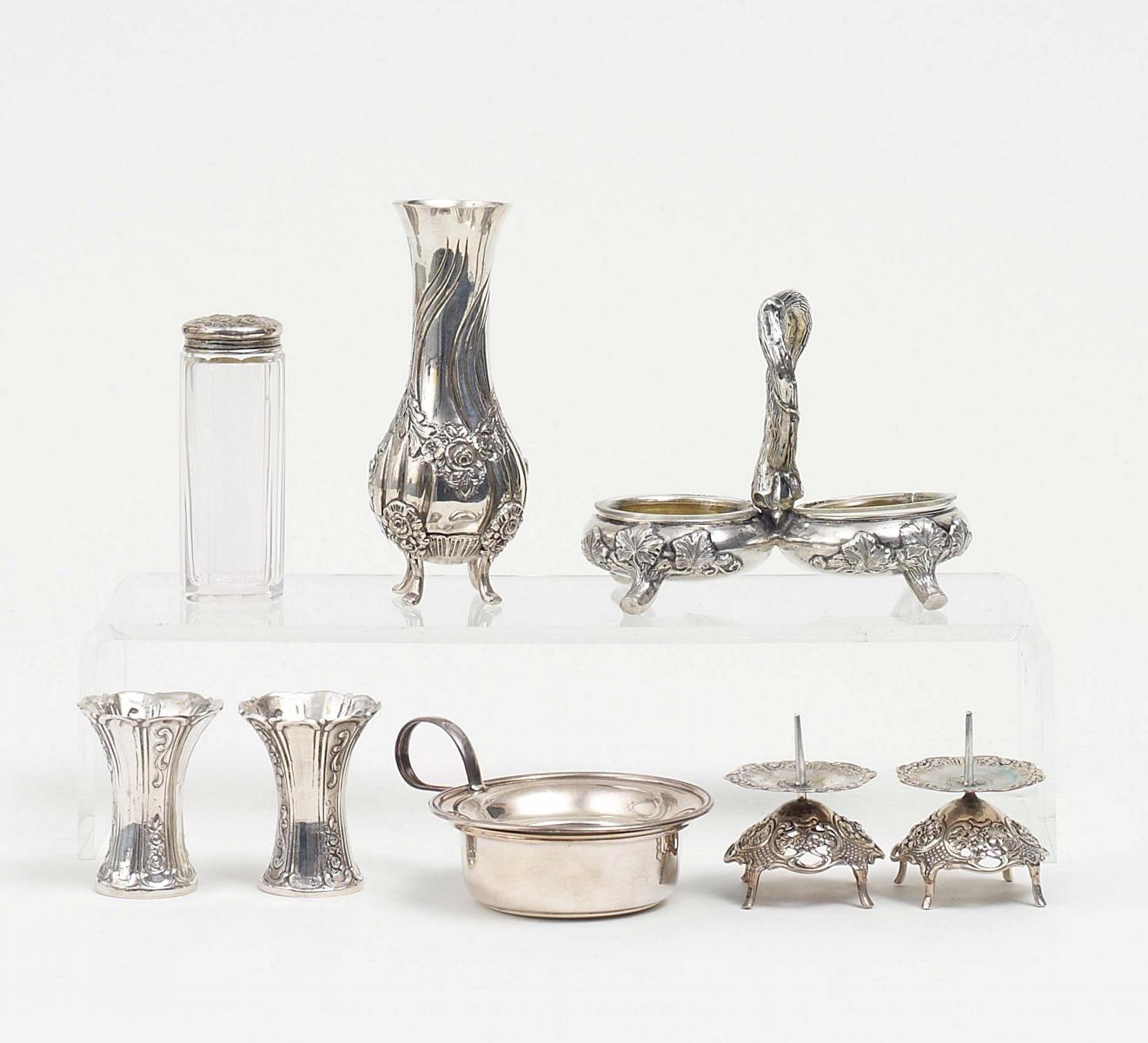 KONVOLUT 3 KLEINE VASEN, 2 KLEINE KERZENSTÄNDER, TEESIEB MIT UNTERSATZ, FLAKON, GEWÜRZGEFÄß.