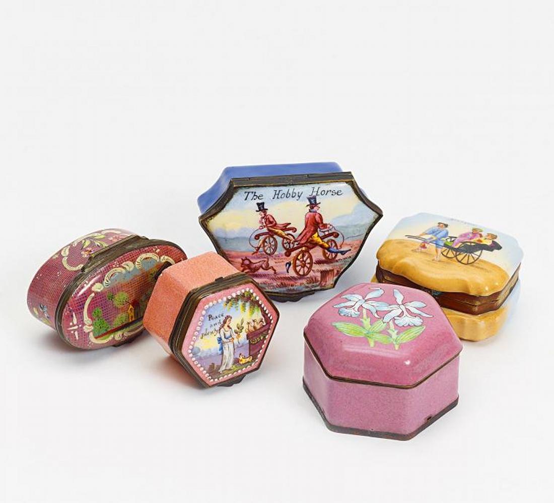 Metall. Emaildekor. Porzellan, farbig staffiert. Metallmontierung. 5,5x3x4,5cm/6x3,5x5cm/4,5x3x4,5xm/7,5x3x5cm/6,5x3x4 cm.