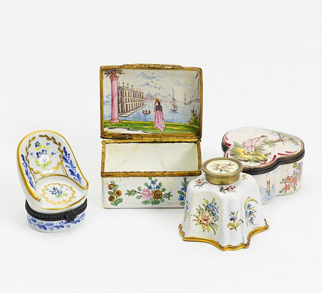 Metall. Emaildekor. Porzellan, farbig staffiert. Metallmontierungen. 6x3,5x6cm/5,5x5x5,5cm/7x3,5x5cm/4x6x5 cm.