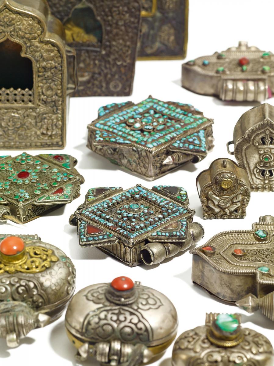 Technik: Kupfer, Silber und weitere Metalle in Repoussé und mit Steinbesatz.