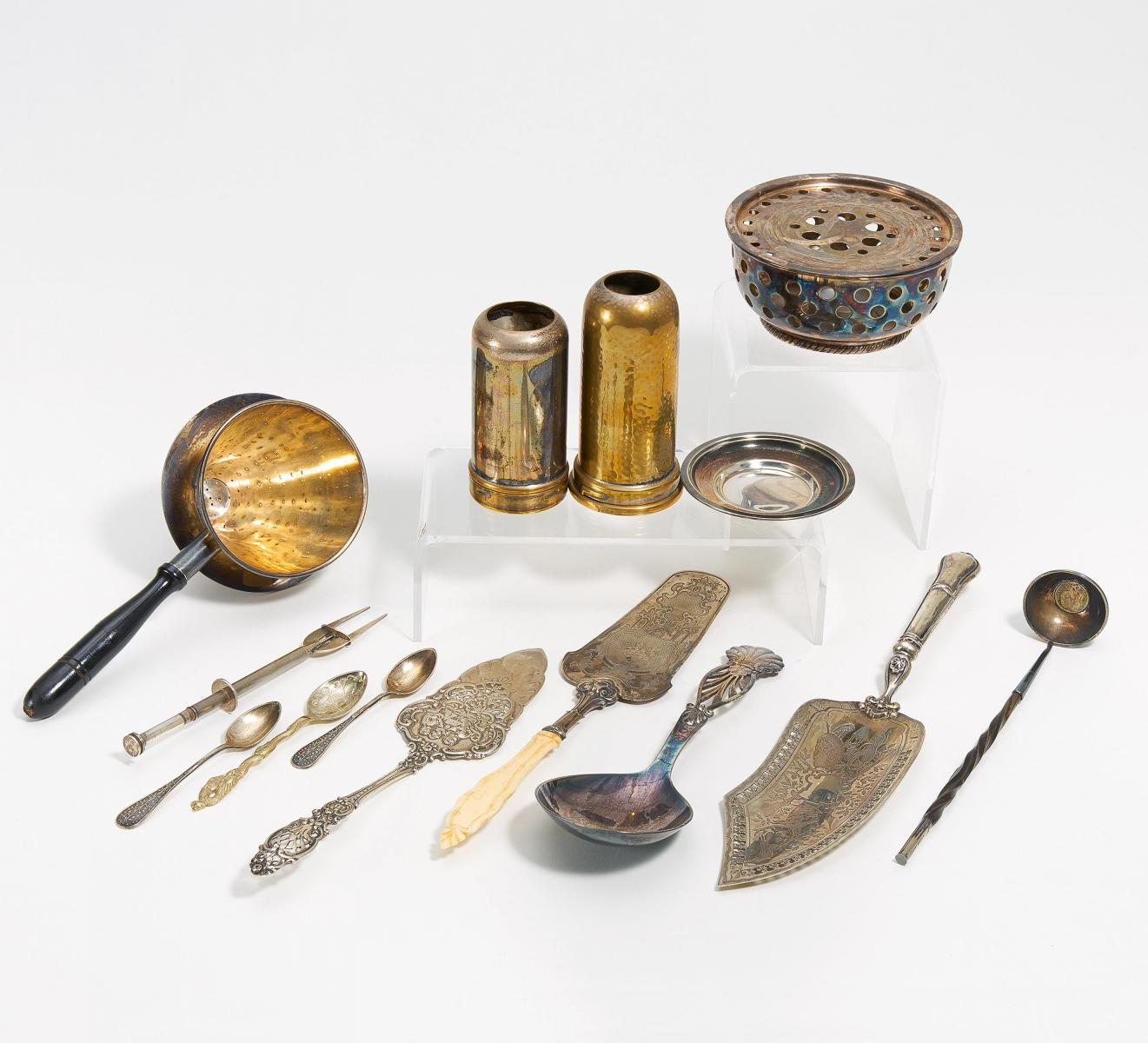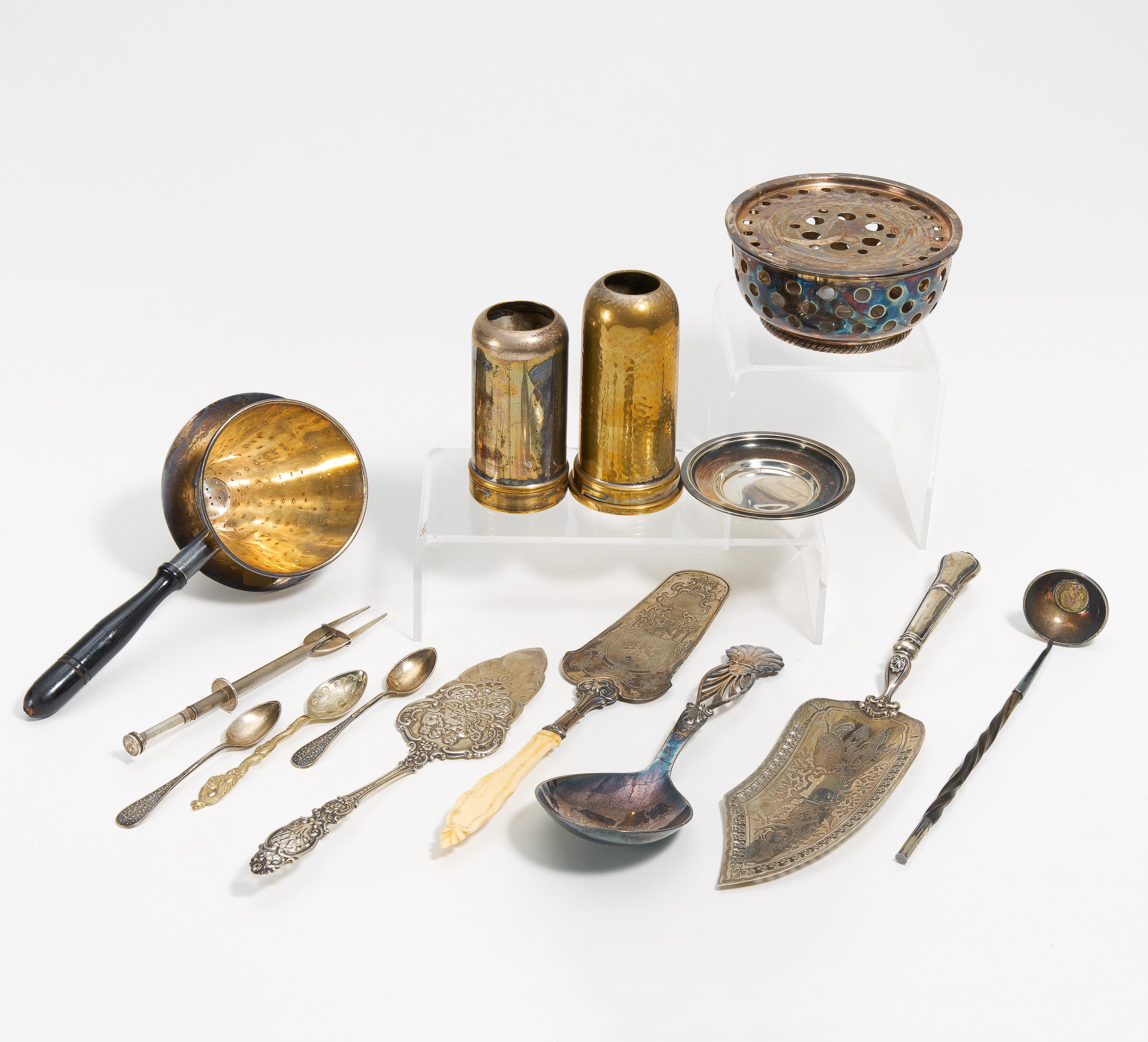 KONVOLUT VON VORLEGE- UND BESTECKTEILEN, 1 RECHAUD, 1 KAFFEEFILTER, 2 KERZENHÜLLEN.