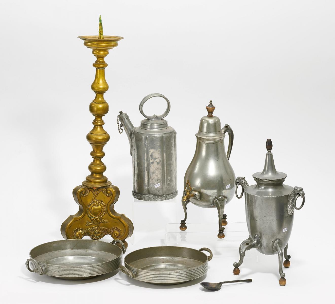 Beschreibung: 1 Leuchter, 2 Schalen, 2 Dröppelminnen, 1 Kanne, 1 Deckelhumpen, 2 Teller.