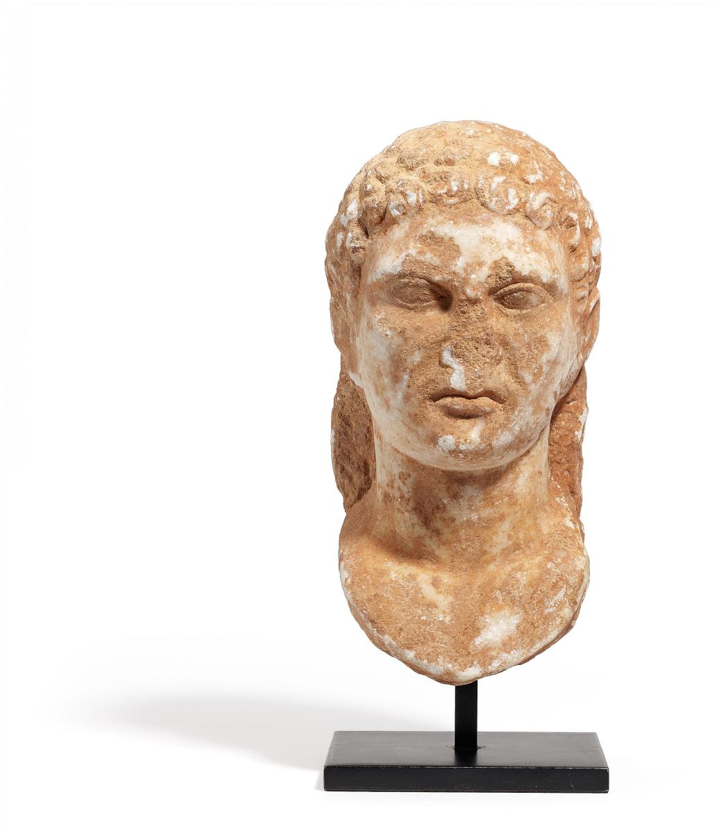 Beschreibung: Antlitz mit ernstem, konzentriertem Ausdruck. Auf der Stirn sind die Locken zu Spiralen