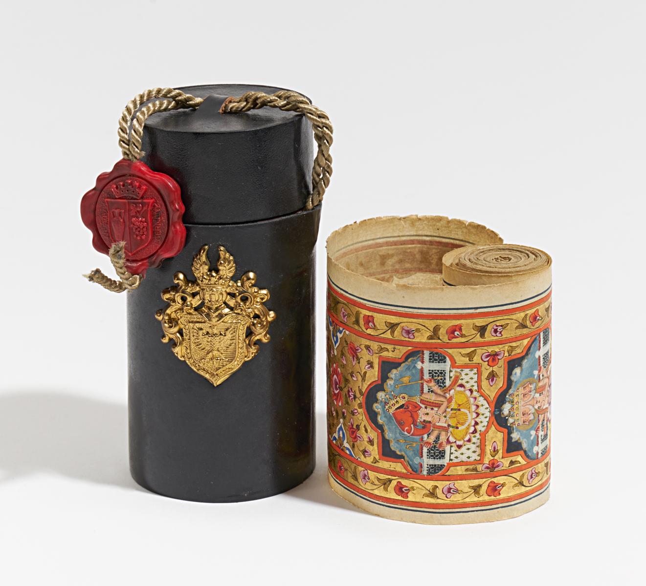 Technik: Papier, farbig staffiert und beschrieben. Leder.