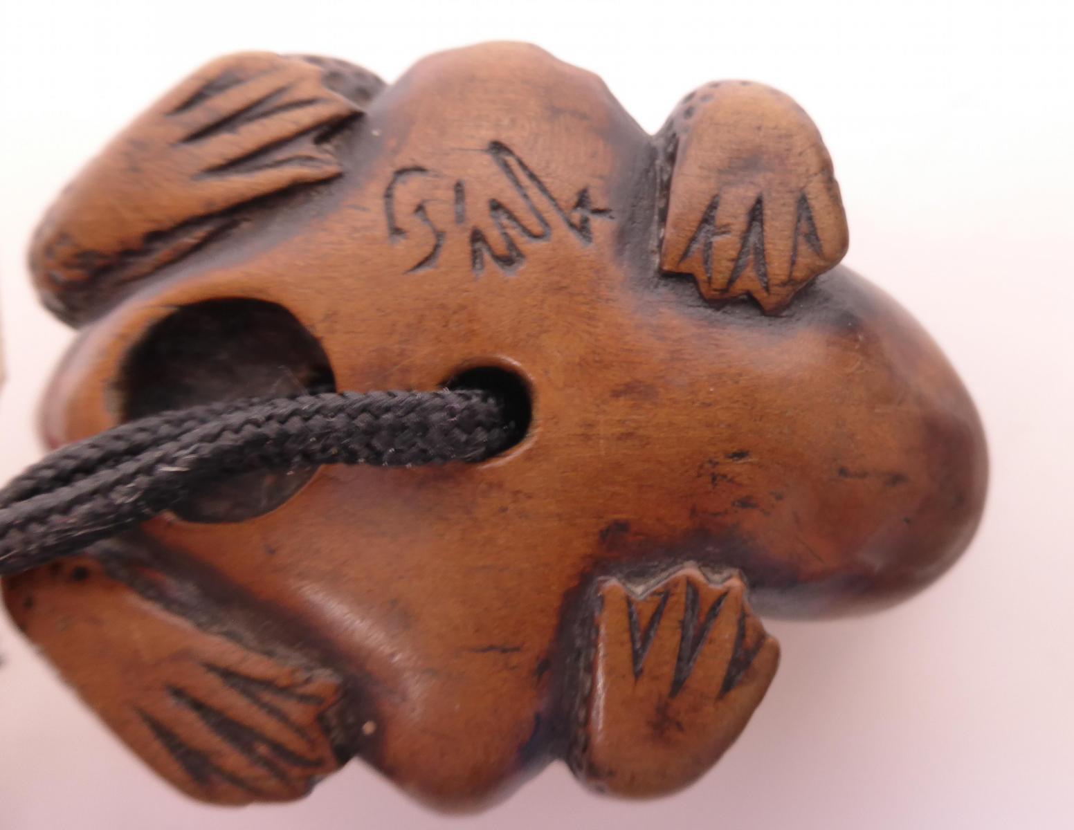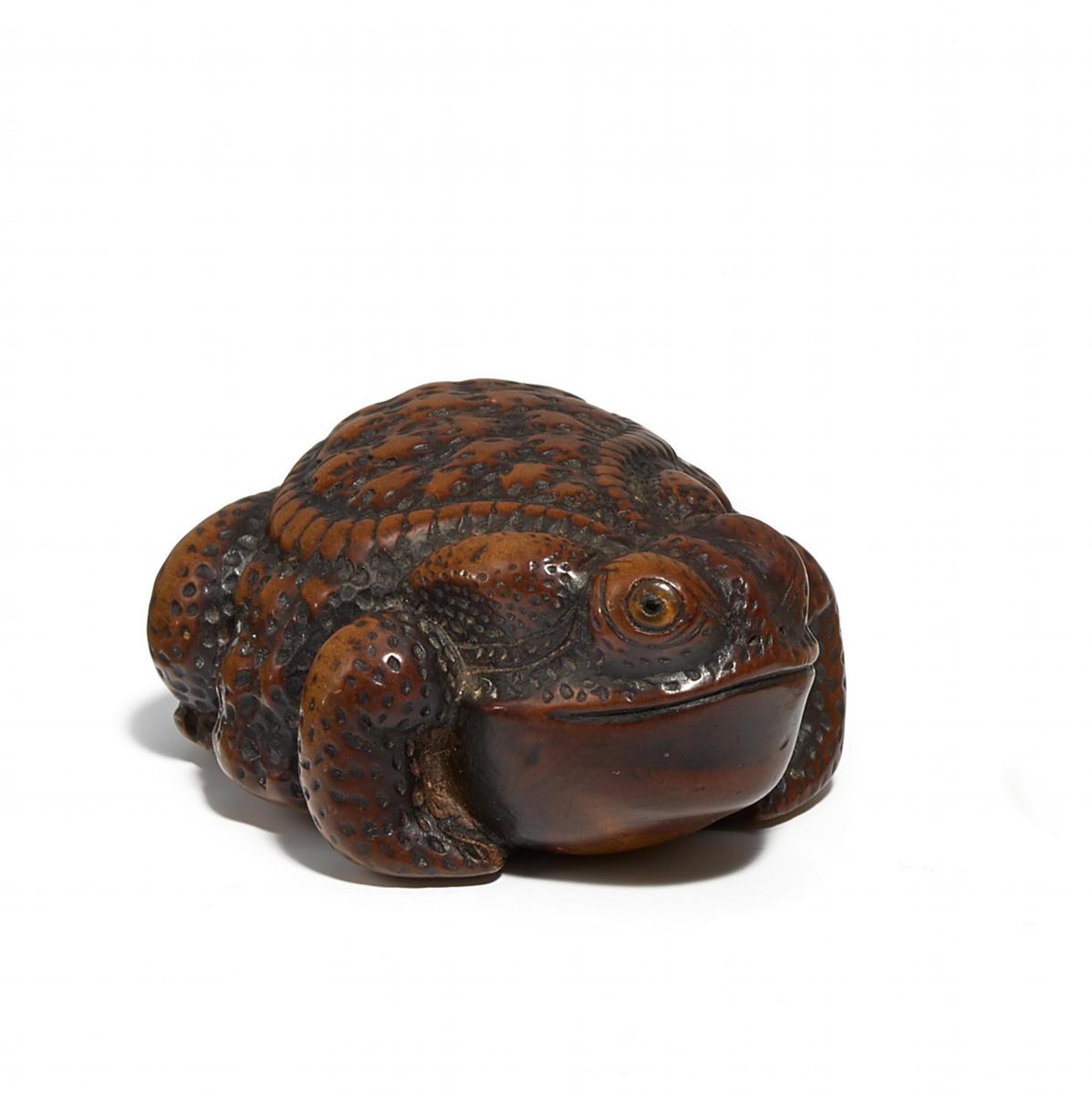 Technik: Buchsbaum, kräftig geschnitzt, die pustelige Haut mittels Gravuren und dunkler Einfärbung sehr naturgetreu wiedergegeben.