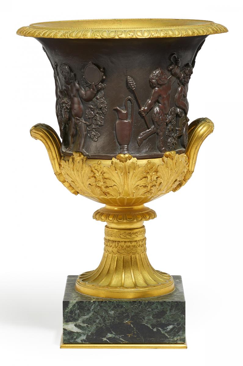 Bronze tlw. patiniert und vergoldet. Marmorsockel. Auf der Wandung umlaufend Bacchantenzug. Höhe 35,5 cm. Zustand B.