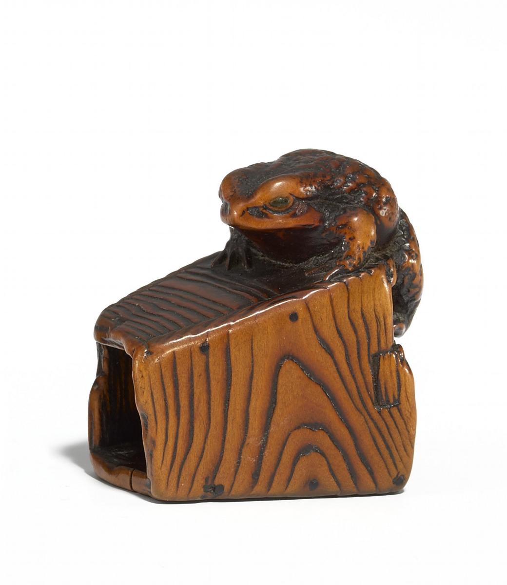 Technik: Buchsbaum mit fein geschnitzten Details wie die Krötenhaut und die Maserung des Eimers.
