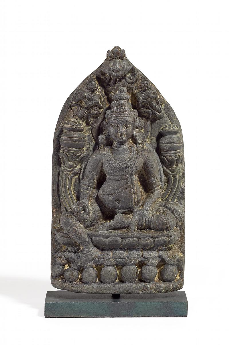 Beschreibung: Sitzend auf einem Lotos, unter dem zahlreiche Schatzbehälter aufgereiht sind, weitere an