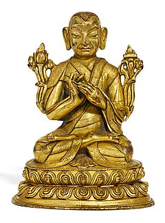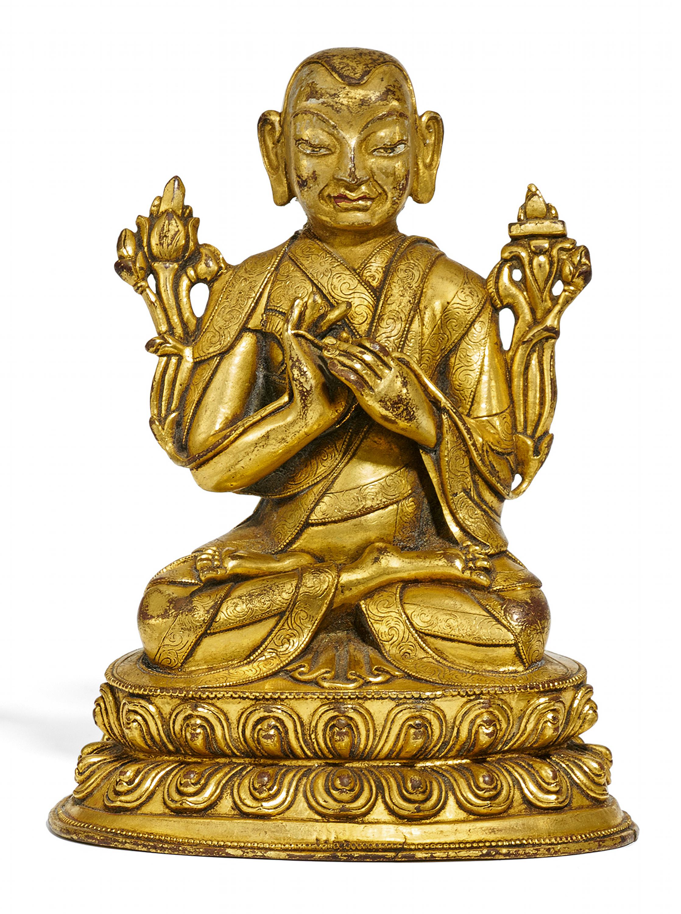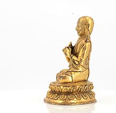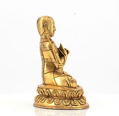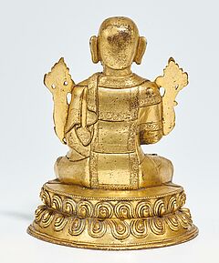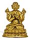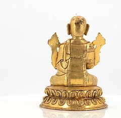 Beschreibung: Sitzend in dhyanasana auf einem doppelten Lotos. Die beiden Hände in Lehrgeste halten die